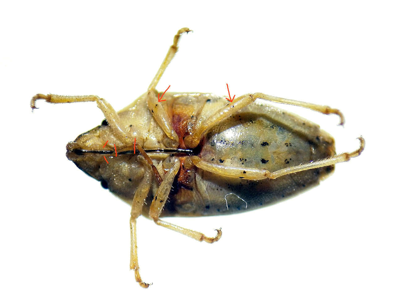 Además de estas dos especies, en el noreste de la Península Ibérica constan otras tres del mismo género: A. germari, A. klugii y A. notata [1]. No es fácil la distinción entre estas especies. Sin embargo, gracias a la guía de Marta Goula et al. [2], sí puedo distinguir Aelia acuminata del resto. En este manual se indica que esta especie se diferencia por las manchas negras en la parte ventral de los fémures de las patas medias y posteriores, y por el segundo artejo antenal más corto que el tercero. Esto es lo que he indicado en la figura número 3.