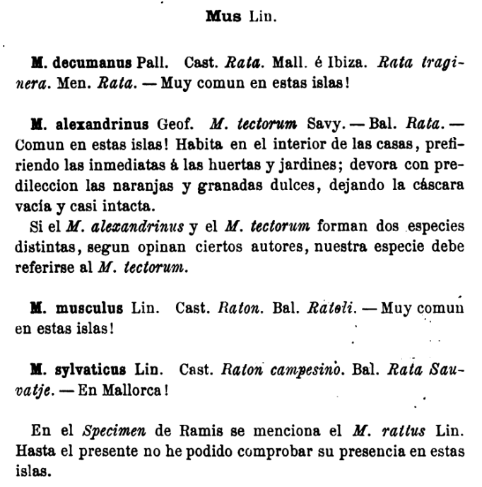 «M. alexandrinus Geof. M. tectorum Savy. Bal. Rata. Comun en estas isalas! Habita en el interior de las casas, prefiriendo las inmediatas á las huertas y jardines; devora con predileccion las naranjas y granadas dulces, dejando la cáscara vacía y casi intacta. Si el M. alexandrinus y el M. tectorum forman dos especies distintas, segun opinan ciertos autores, nuestra especie debe referirse al M. tectorum» (p. 56).
