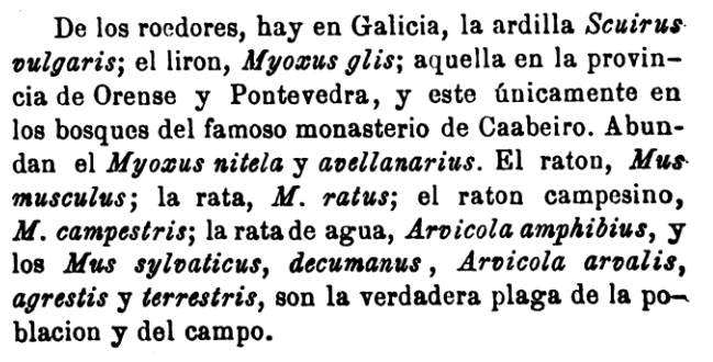En 1867 Fernando Fulgosio ‘Crónica de la provincia de Pontevedra’ [14] En el capítulo VIII hace una reseña zoológica donde menciona algunas especies para Galicia. Cita Mus musculus, Mus rattus y Mus decumanus para Galicia sin concretar provincias.