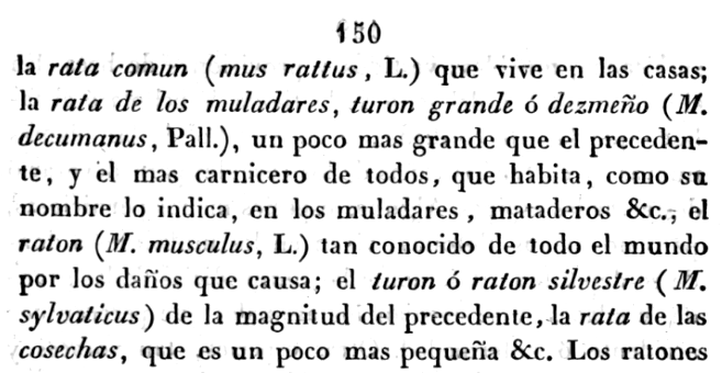 «M. decumanus, Pallas. Syn. M. javanus, Hermann. Cast. Rata. Habita en el interior de las casas, en las cocinas, cuadras y demás habitaciones que comunican con los sumideros, cañerías de aguas sucias ó depósitos de inmundicias» (p. 26).