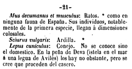 En 1859, Pascual Pastor López (1818-?) publicó sus ‘Apuntes sobre la fauna asturiana bajo su aspecto científico e industrial’ [11]. Pastor López fue catedrático de Ciencias Naturales de la Universidad de Oviedo y luego de la de Valladolid. Se trata de un listado de las especies por él observadas. En la página 21 aparecen citadas el Mus decumanus y el Mus musculus. Destaca de la primera especie su gran tamaño. Es curioso que no mencione R. rattus. Si no fuera porque el autor era catedrático sobre la materia, pondría en duda su cita.