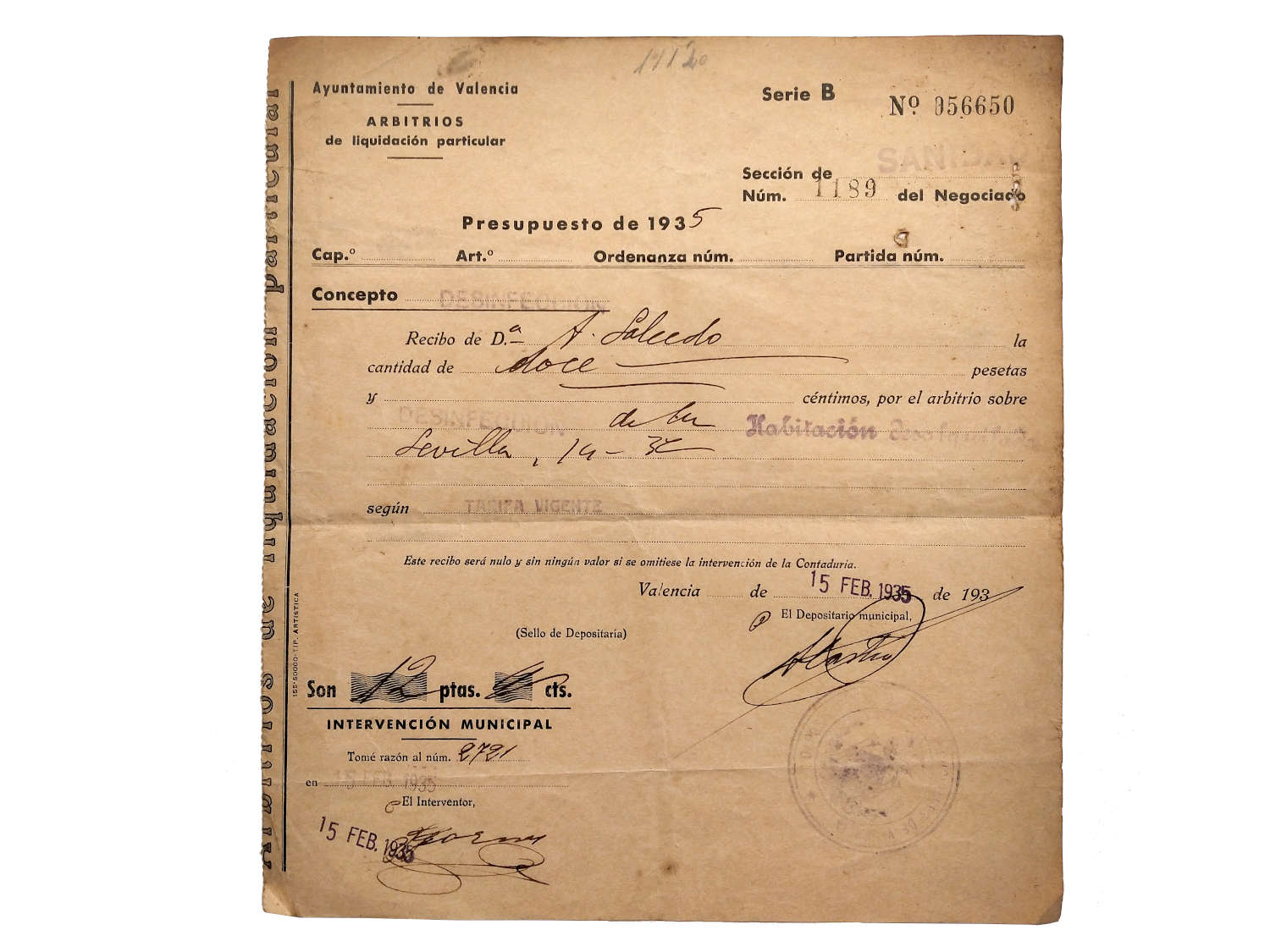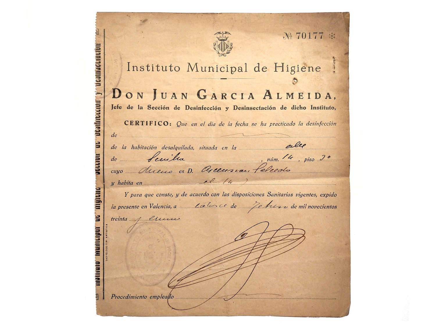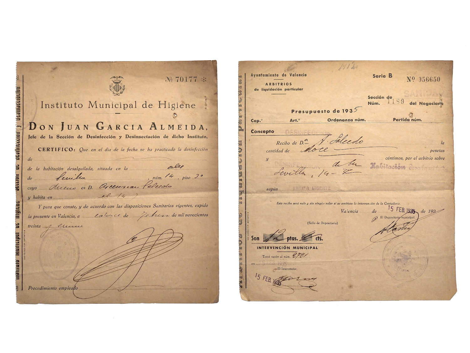 He adquirido estos documentos por su antigüedad y porque son la parte tangible de una desinfección llevada a cabo en una habitación desalquilada. Consta como lugar del tratamiento la calle Sevilla, 14, planta tercera. Figura el nombre de Ascensión Salcedo en calidad de propietaria. El certificado lleva el número 70.177. Certifica la desinfección Juan García Almeida, Jefe de la Sección de Desinfección y Desinsectación del Instituto Municipal de Higiene. En el recibo consta que se pagaron 12 pesetas según tarifa vigente.