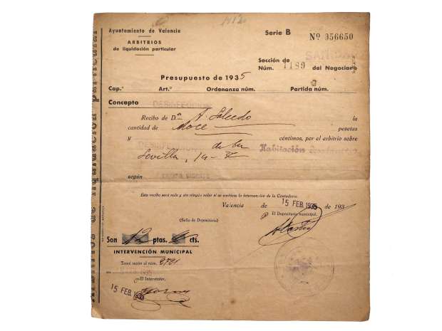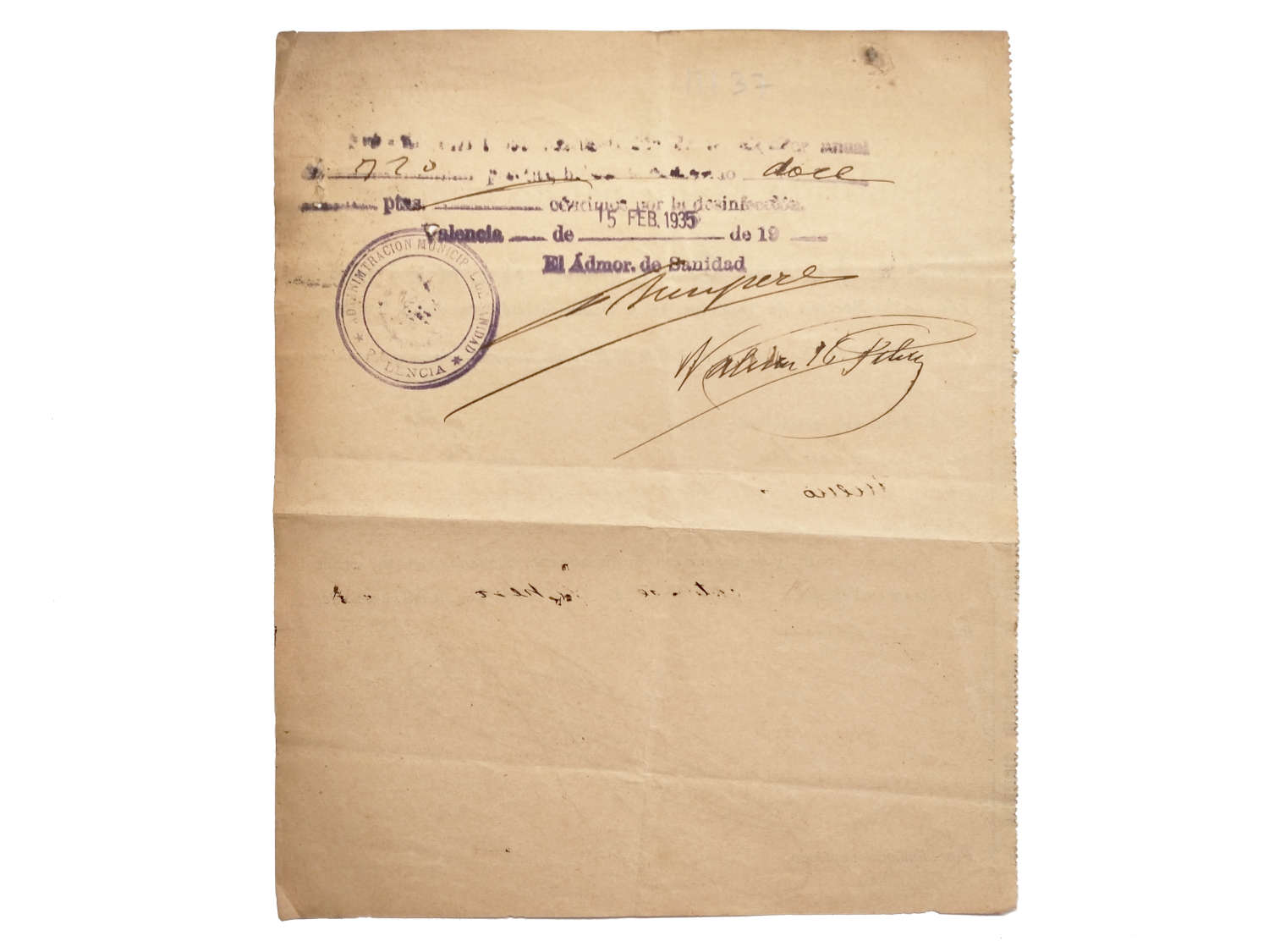 En la imagen número 1, se pueden ver dos documentos. En la parte izquierda, hay un certificado de desinfección emitido por el Instituto Municipal de Higiene de Valencia con fecha del 14 de febrero de 1935. Más abajo se puede ver este mismo certificado por su anverso (Fig. 2) y reverso (Fig. 3). Y en la parte derecha, consta el recibo del pago por la dicha desinfección con fecha al día después. También abajo se puede ver el mismo documento con mayor resolución (Fig. 4).