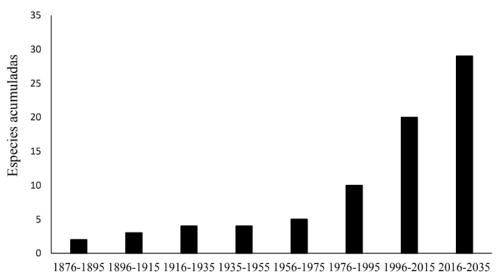 Para acabar, apuntar que Espadaler y Ruiz Ramos cuentan 28 especies exóticas como establecidas para España peninsular. Publican una gráfica de barras donde se ve de manera visual la detección de especies exóticas (figura 2). Se puede ver cómo se ha ido acelerando la entrada de especies fruto de la hiperglobalización en la que vivimos.