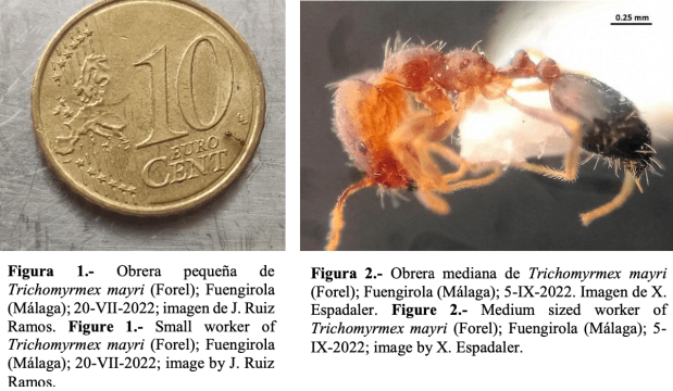 Se ha publicado en el ‘Boletín’ de la Sociedad Andaluza de Entomología (sae-insectos.org) una nota científica sobre la especie exótica Trichomrymex mayri (=Monomorium mayri) [1]. Sus autores, Espadaler y Ruiz Ramos, dan la especie como establecida en Fuengirola, Málaga. Esta sería la segunda cita que tenemos de esta especie en España. Con anterioridad fue detectada en un palmeral en Agost, Alicante [2]. Parece ser que mientras el palmeral estuvo en activo hubo presencia de varias especies exóticas de las que se guardó muestra. T. mayri consta que estaba allí en 2007, pero no posteriormente. Años más tarde, se pasó por la zona cuando cesó la actividad de cultivo y no se volvió a detectar.