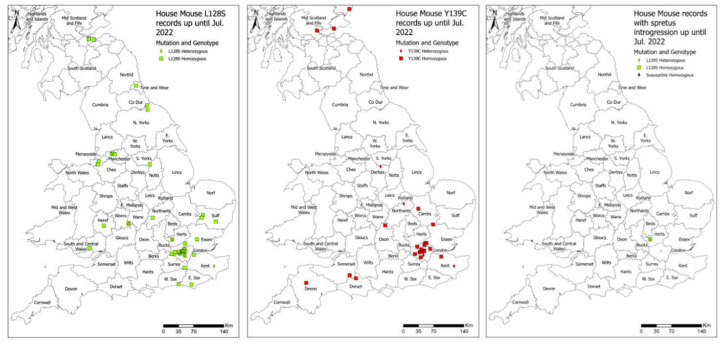 Este último reporte nos ha traído una interesante noticia. Se ha detectado por primera vez en Reino Unido resistencia en ratón doméstico (Mus musculus domsesticus) por introgresión de ratón moruno (Mus spretus). Esto ha sido detectado en Hertfordshire, al sureste de Inglaterra. Esta resistencia es llamada ‘introgresión spretus‘ y tiene su origen en la península Ibérica donde ambas especies son simpátricas en una amplia zona geográfica que excluye la parte más septentrional.