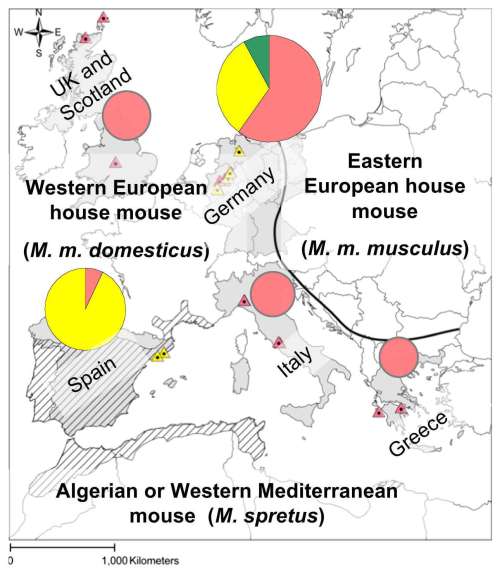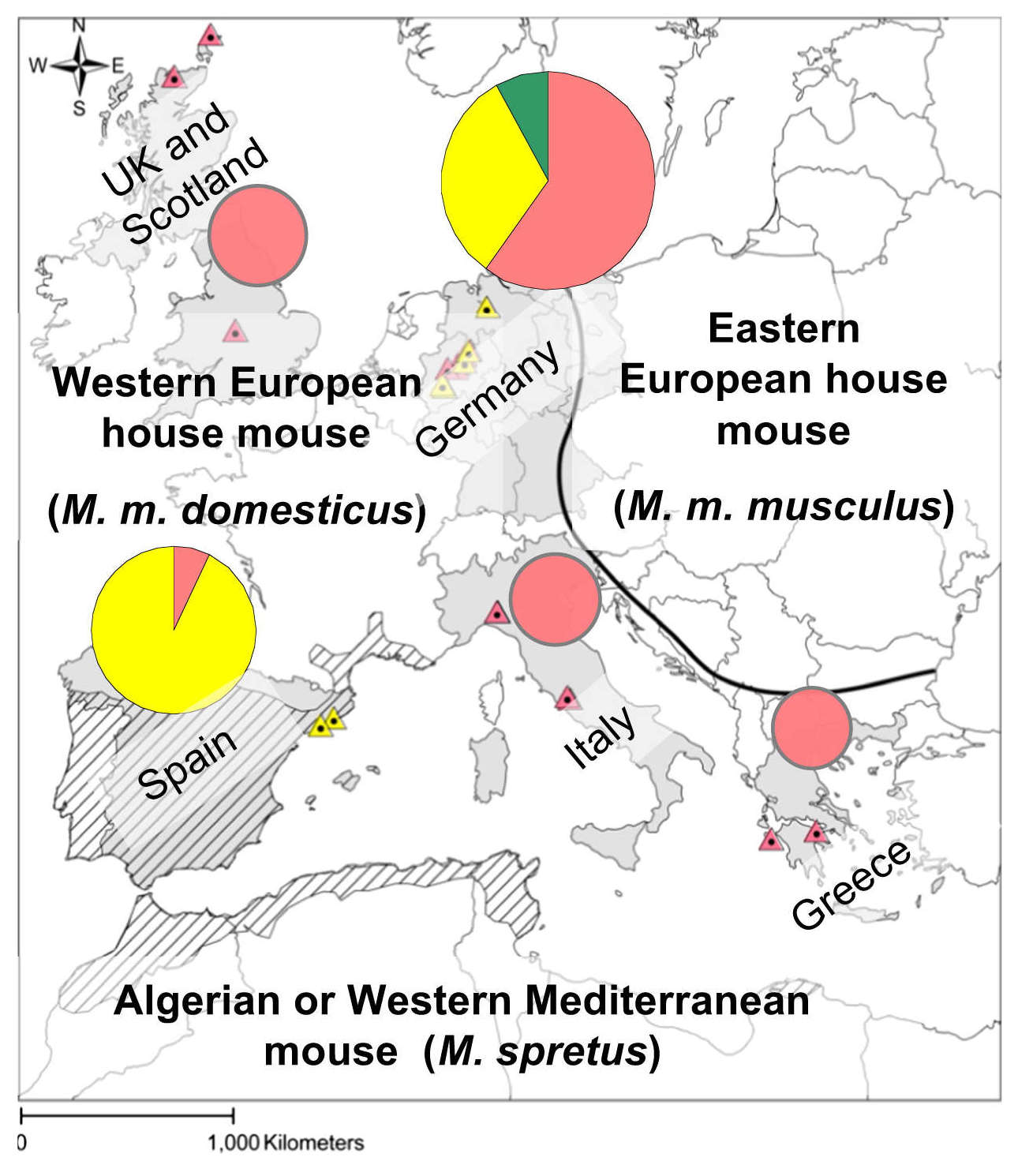 La primera noticia sobre la resistencia por introgresión spretus fue en 2011 con la publicación de un artículo a cargo de Song et al. [4]. Se estudiaron individuos de M. musculus domesticus de España (Barcelona), Italia, Grecia, Reino Unido y Alemania. Se compararon las mutaciones implicadas en la resistencia en el gen Vkorc1. Fueron detectados 20 genotipos y se establecieron cuáles eran propios de M. musculus domesticus y cuáles eran por introgresión de M. spretus. En la figura número 2, se puede ver el resumen sobre un mapa. El rojo muestra los genotipos salvajes y en amarillo los que tienen la introgresión spretus. El mapa muestra además la distribución de ambas especies.