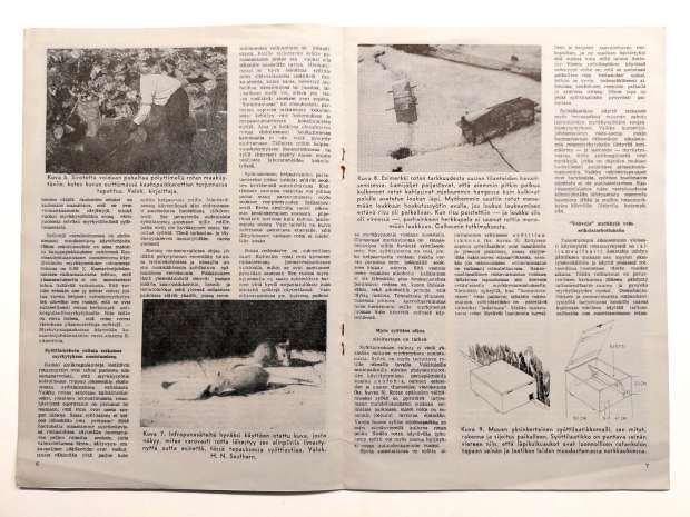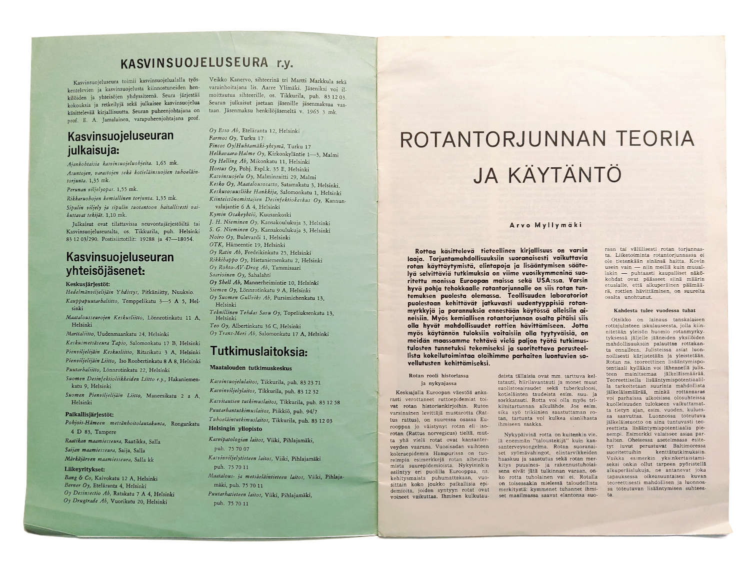 Este manual en finés fue publicado dentro de la colección ‘Kasvinsuojeluseuran julkaisuja’ dedicadas a la protección de las plantas. Fue publicado en 1965. Arvo Myllymäki, su autor, fue un biólogo especializado en mamíferos. He escrito fue porque no he encontrado información sobre su biografía. Sin embargo, sí he encontrado un buen número de publicaciones dedicadas al control de ratas, ratones, topillos y otros pequeños mamíferos con afectación sobre el cultivo de plantas (jukuri.luke.fi). Publicó tanto obras de divulgación en finés como de investigación principalmente en inglés.