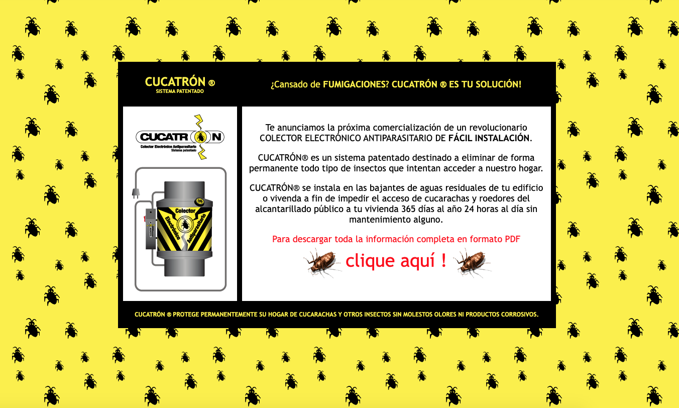 La historia del control de plagas es la de sus aciertos, pero sin duda también la de sus desaciertos. Es tan importante saber qué funciona como lo que no. Pero lo que no funciona puede pasar al olvido. Y esto significa que podemos volver a tropezar. Voy a dar cuenta de un caso interesante. Me intriga saber qué pasó con Cucatrón, aparato que fue publicitado como «colector electrónico antiparasitario para redes de saneamiento». Sí conozco el final, un fracaso. Pero desconozco si llegaron a venderse muchas unidades de Cucatrón y cómo fue la decadencia de lo que parecía una gran solución a los problemas de cucarachas en edificios. En pocos años pasó de ver el cielo a pisar el barro.