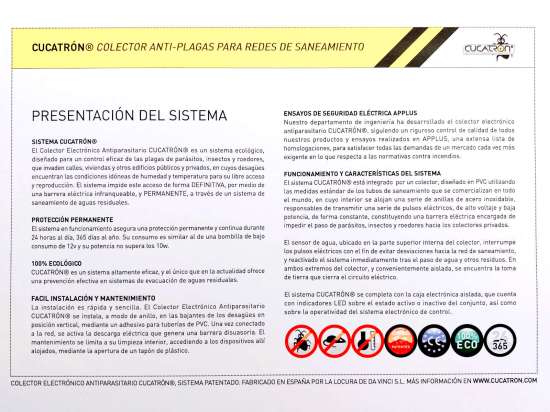 Respecto al primer contenido web, aparece disponible en la Wayback Machine un documento en PDF de 2007 [2]. Según se puede ver, Cucatrón fue comercializado inicialmente en tres modelos para adaptar a las diferentes secciones de tubo. Había un CUCATRÓN 110 (para tuberías de 110 mm de diámetro) que se vendía a 310 euros IVA incluido. Y también un CUCATRÓN 200 (200 mm de diámetro) de 380 euros y, un CUCATRÓN 300 (300 mm), de 480 euros. También cabía la posibilidad de obtener un dispositivo adaptado a medidas no estándar. No me parece caro el dispositivo para la utilidad que tiene. Eso sí, en un edificio con varios bajantes se necesitaba uno para cada uno.