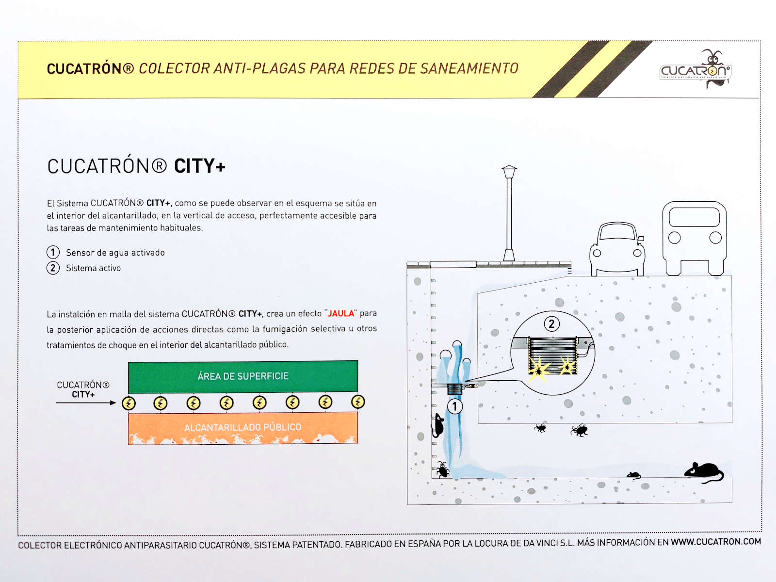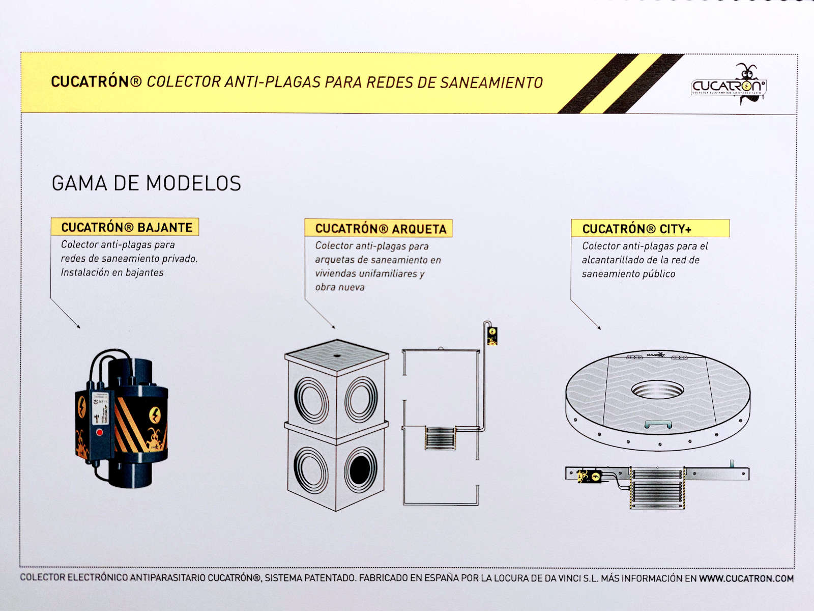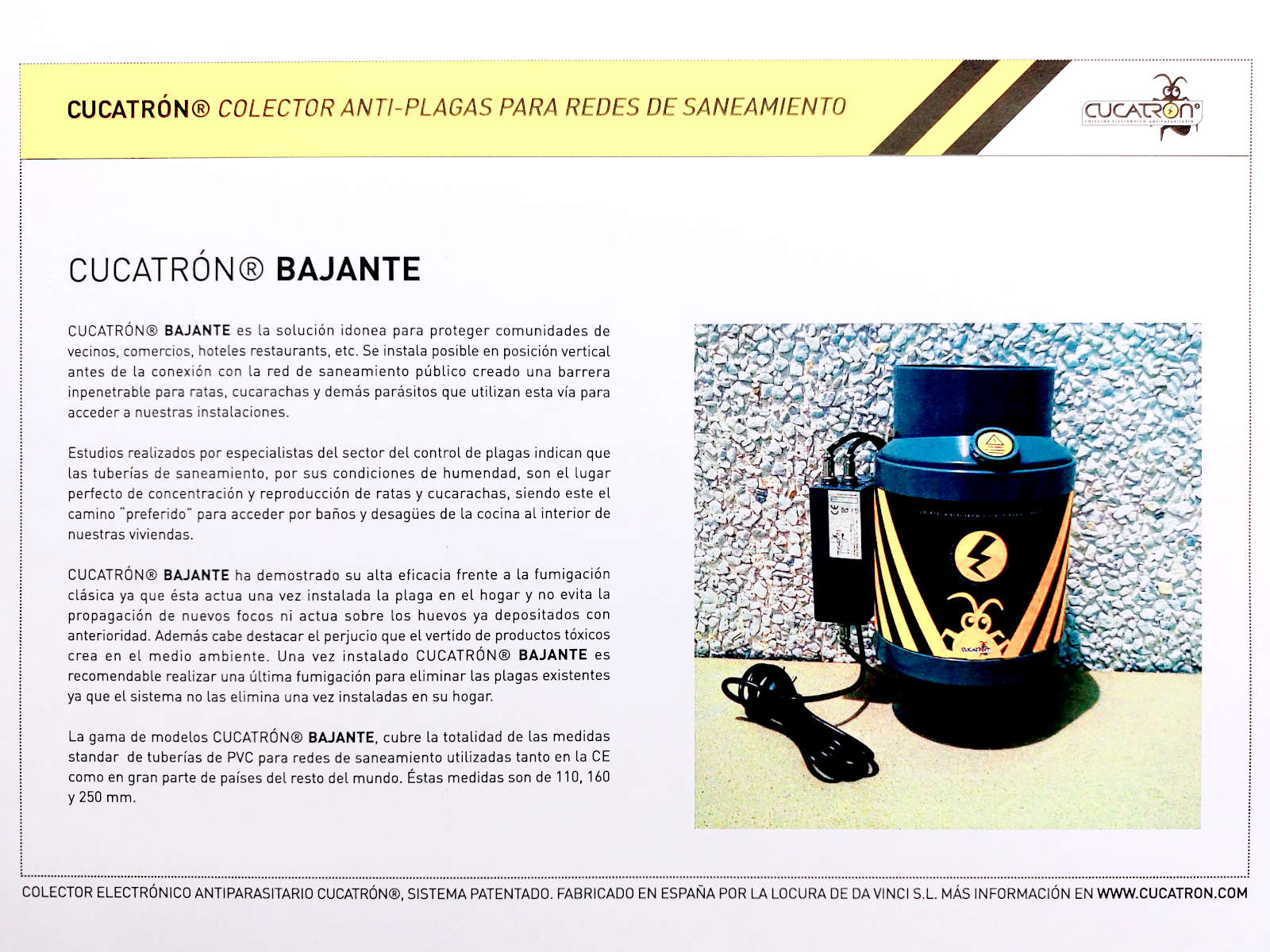 En la imagen número 1, se pueden ver dos catálogos que he conseguido de Cucatrón. Parece que son de 2008. Por una parte, en uno de los catálogos aparecen ahora cuatro modelos: CUCATRÓN 110, CUCATRÓN 160, CUCATRÓN 250 y CUCATRÓN 500. Parece ser que estos cuatro modelos eran suficientes para adaptar el dispositivo a los distintos diámetros de bajante. Por otra parte, el dispositivo patentado pasó a llamarse CUCATRÓN BAJANTE para diferenciarse de dos nuevas soluciones CUCATRÓN ARQUETA y CUCATRÓN CITY. Parece que surgieron nuevas necesidades de dar mayor protección. CUCATRÓN ARQUETA era para colocar en el albañal en arquetas de saneamiento de viviendas unifamiliares. Y CUCATRÓN CITY fue ideado para el alcantarillado de la red de saneamiento público con vistas a venderlo a los ayuntamientos. En las imágenes 6 a 11 se pueden ver algunas páginas de uno de los catálogos donde se describen estas tres soluciones.