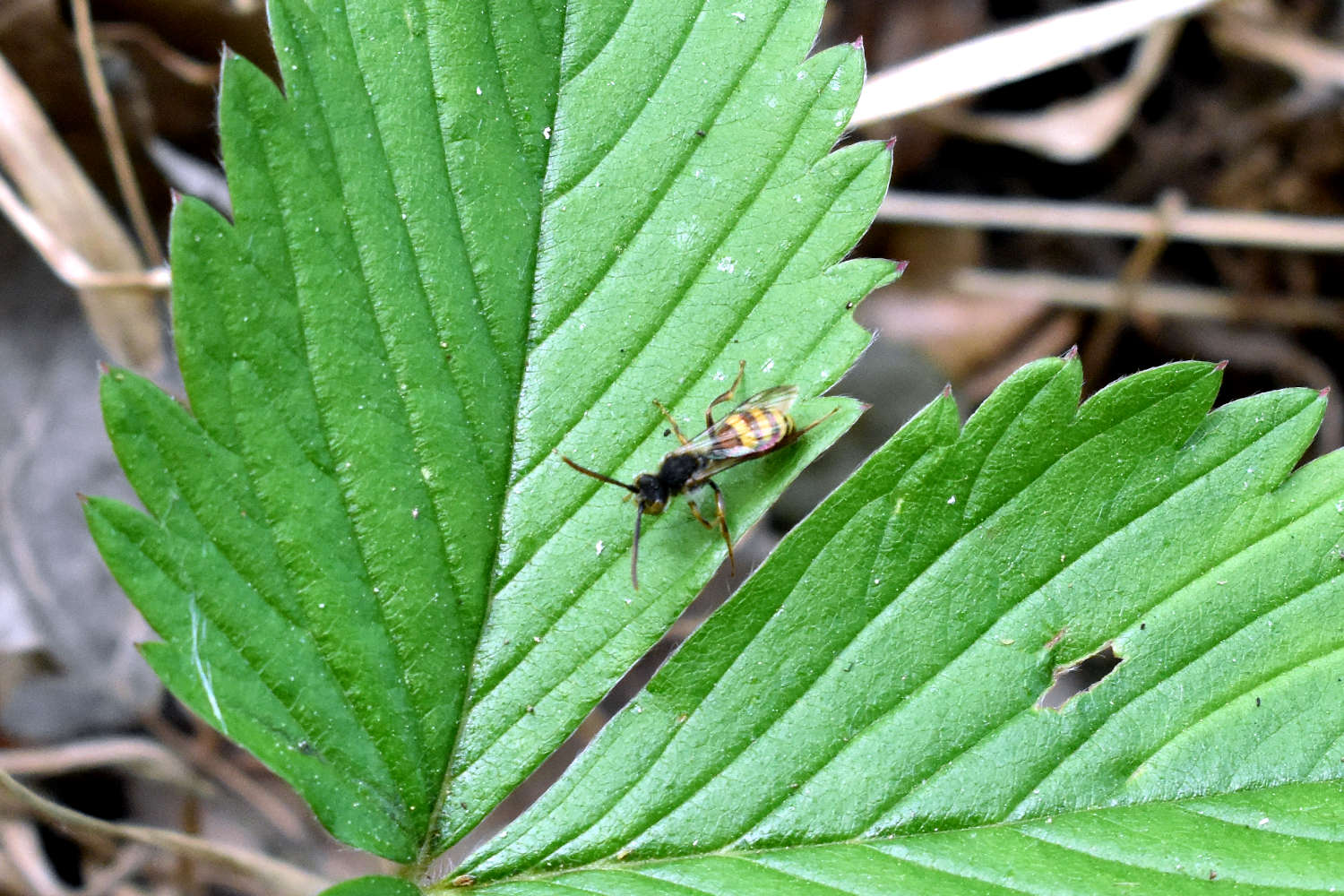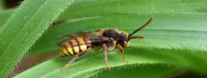 Me fijé que sobre unas plantas volaban unas abejas de aspecto alargado. Se podían confundir por la forma y color con avispas. No sabría decir el número que vi, pero no más de 10 revoloteando por la misma zona. Entonces me acerqué para tomar algunas fotos y saber de qué especie se trataba. Tomé las fotografías más nítidas que pude, a pesar de no llevar una buena lente y de que las abejas escapaban en cuanto me aproximaba. Sin embargo, gracias a la paciencia, conseguí alguna foto nítida donde se puede ver la venación alar. Gracias a ello en casa he sabido que se trata de abejas del género Nomada que pertenecen a la familia Apidae, antes clasificadas en Anthophoridae.