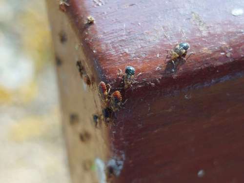 Recientemente tuve un caso interesante de picaduras por chinches depredadoras. Sabía que heterópteros como Anthocoris o Orius utilizados en control biológico de plagas podían producir picaduras [1]. Pero no había tenido un caso importante como para pararme a observar. Como sabemos, las tipuanas (Tipuana tipu) tienen su propia especie de psila (Platycorypha nigrivirga). En un parque público del área metropolitana de Barcelona creció bastante esta psila (figura 1). Y con ello los depredadores como Anthocoris que se desarrolló acorde al depredado. Como consecuencia, de las tipuanas caían ninfas y adultos de este heteróptero llenando los bancos y otro mobiliario urbano (figuras 2-4). Es normal encontrar psila y Anthocoris en las tipuanas, que abundan en la zona de Barcelona. Pero no lo es tanto que sea alto su número.