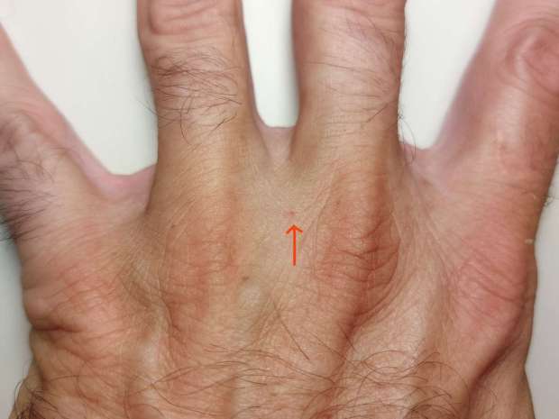 Ahora bien, al tener un caso tan claro, me desplacé al lugar donde pude ver muchas ninfas de Anthocoris de distintos estadios de crecimiento (figura 11). En un principio, pensé que se había hecho una suelta para control biológico, pero los responsables de jardinería dijeron que no, que Anthocoris había aumentado porque la psila lo había hecho. El asunto era saber si Anthocoris picaba a las personas de manera accidental o voluntaria. Y pude observar que era de manera voluntaria. Para ello puse la mano izquierda sobre un banco donde había muchas ninfas correteando en todas direcciones. Se subieron sobre mi mano rápidamente y sin problema (figura 5). Y algunos no tuvieron inconveniente en picarme (figuras 6 y 7). Algunas clavaron su probóscide y lo dejaron estar. Y un par picaron bien profundamente. Observé una de las ninfas que me picó sin problema (figura 6). Al día siguiente me encontré pequeñas picaduras sobre la mano (figura 8), excepto una importante con una pequeña roncha que correspondía con una que me picó profundamente en la zona interdigital (figuras 9 y 10). La roncha indicaba que había sacado sangre.