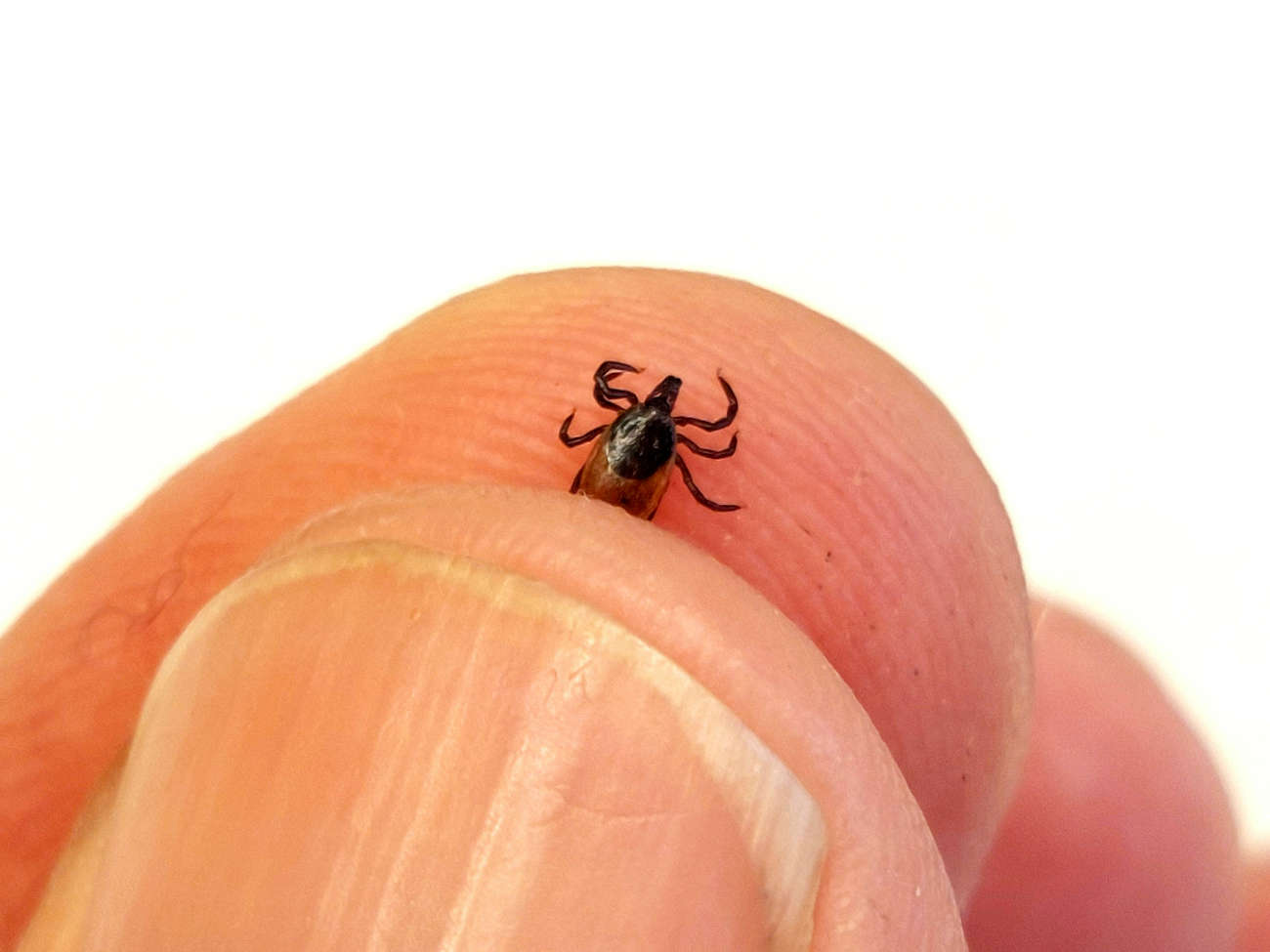 Acostumbrado a garrapatas de mayor tamaño que suelo encontrar en Barcelona como Dermacentor, Hyalomma o Rhipicephalus, no es fácil avistarla. En las imágenes 2 y 5 se aprecia su tamaño en relación a mis dedos. Estaba sobre una hoja de hierba en la posición típica de espera (figura 2 y 6). Por suerte, esta garrapata no es como Dermacentor o Hyalomma que cuando detecta tu presencia sale a buscarte para subirse encima. En el caso de Ixodes son pacientes y disciplinadas. Estiran las patas anteriores a la espera de agarrarse. Tras encontrar esta primera hembra, comenté a mi mujer que tomara precauciones. Y especialmente para que me ayudara a encontrar otros individuos por la zona. Ella tiene gran capacidad de observación. Y a los cinco minutos, ella encontré otra. Tras esta no vimos ninguna más.