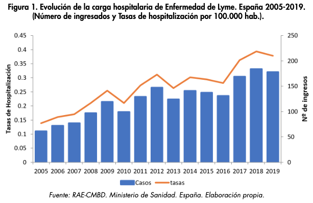 El año pasado fue publicado un artículo en el Boletín Epidemeológico Semanal donde se daba cuenta del aumento de la carga hospitalaria por Lyme en el período 2005-2019 [5]. En la imagen número 4 se puede ver el gráfico de número de ingresos. Los datos muestran una tasa media anual de hospitalizaciones de 0,28 por cada 100.000 habitantes. Este aumento puede ser debido a una realidad y es el aumento en la transmisión de la bacteria a humanos, pero también puede ser que en la actualidad el diagnóstico sea mejor. Esto es obvio visto que hay casos de personas que llevan años arrastrando la enfermedad de Lyme.