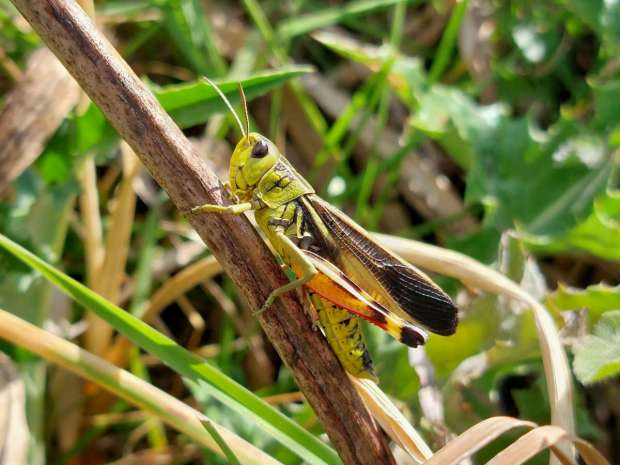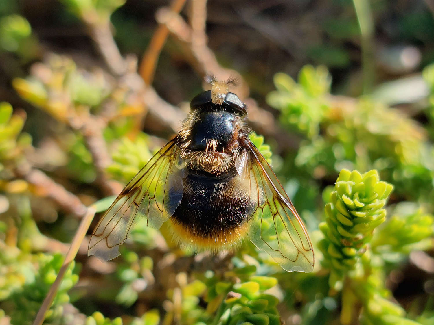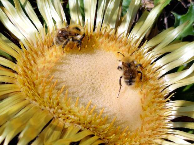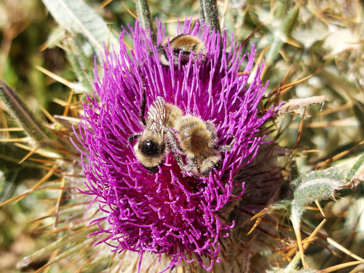 En los prados de alta montaña destacan las mariposas, saltamontes y abejorros. A pesar de la belleza de las mariposas, no siento gran atracción. Sí en cambio por los saltamontes y abejorros. Destaco en la imagen 29 un saltamontes de gran belleza con un sonido característico como es Arcyptera fusca de los acrídidos (Acrididae). En cuanto a abejorros, la alta montaña es el espacio ideal para ellos en la península Ibérica. En los Pirineos se puede encontrar el mayor número de especies. Tomé algunas fotografías de individuos que atribuyo a la especie Bombus mesomelas (figuras 30-32).