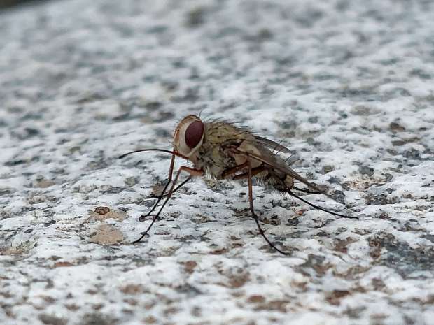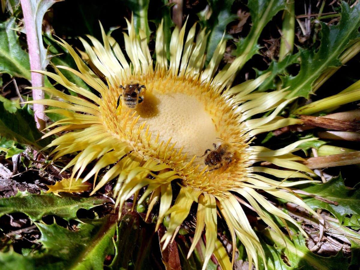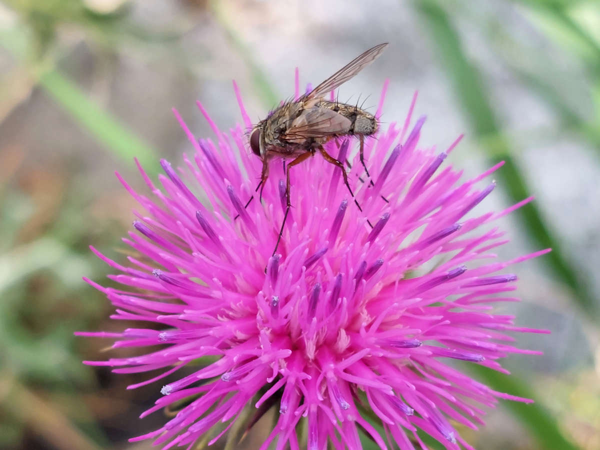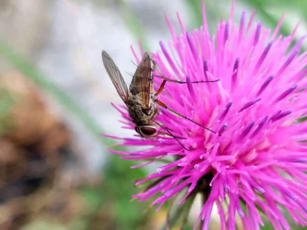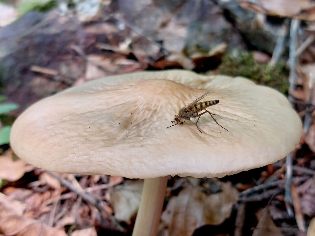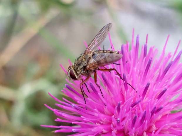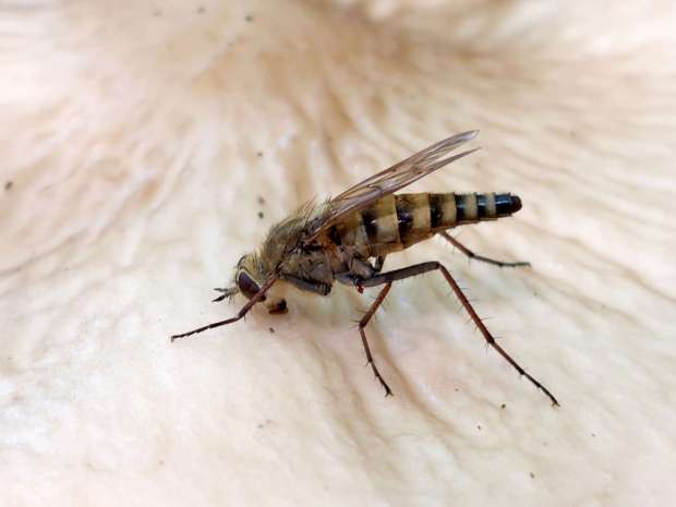 Entre los insectos vistos, destaco primero los dípteros. En las imágenes 21 a 24, se puede ver una mosca Prosena siberita, un taquínido (Tachinidae) provisto de una probóscide para libar flores. Como las otras especies de la misma familia, son parasitoides de coleópteros. Otra familia que me interesa son los sírfidos (Syrphidae). Muestro un par de imágenes de Volucella bombylans (figuras 25-26), especie que parasita los nidos de abejorros. El individuo de las imágenes es una hembra que tiene las alas desgastadas y le faltan pelos en el tórax, lo cual indica que ya tiene un tiempo de vida y habrá depositado sus huevos en diversos nidos de abejorro. Y también es interesante la familia Therevidae de la cual vi un individuo que se alimentaba sobre una seta (figuras 27-28).