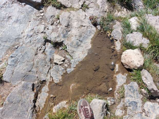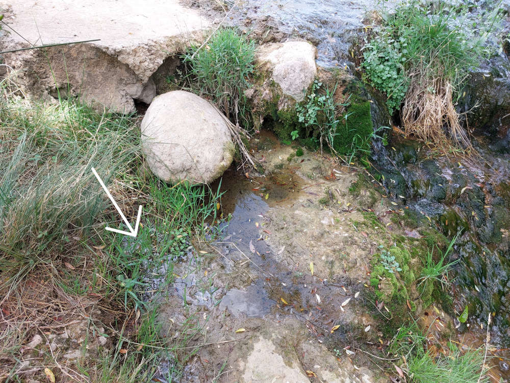 Fig 7. Charco junto al barranco Sarrón en Torres del Obispo, Huesca, con larvas de Culex hortensis./ C. Pradera 08-2023