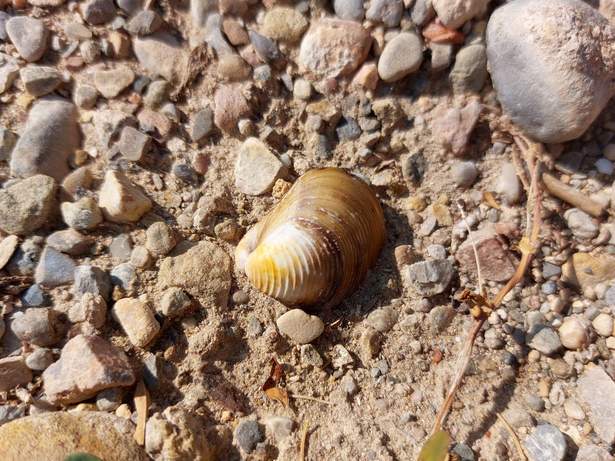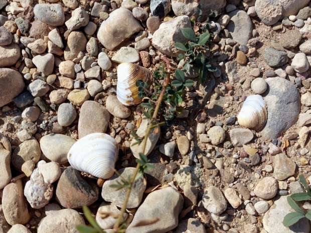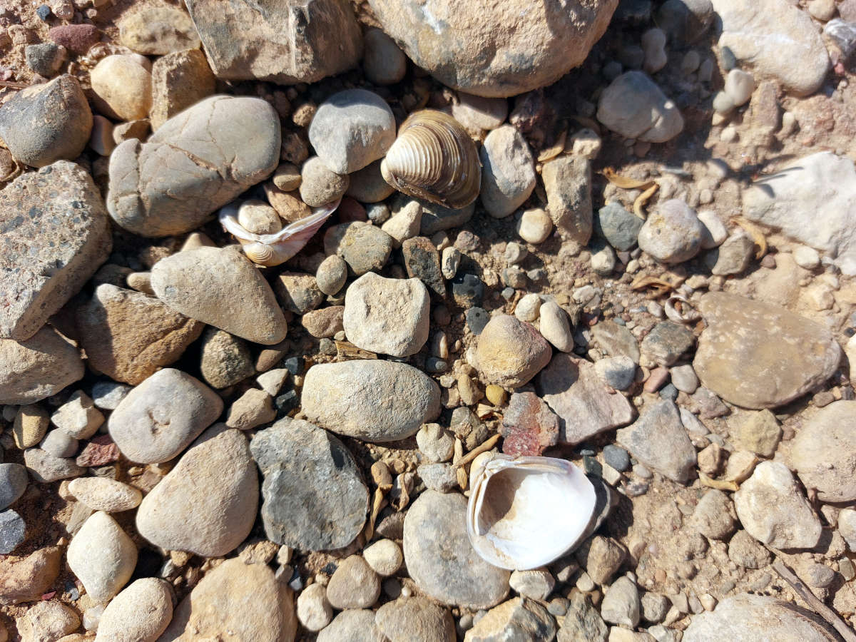 Nunca había visto el pantano de Sant Ponç con el nivel tan bajo como el pasado domingo (figuras 3 y 4). Siempre se mantenía lleno en sus 24 hm3 de capacidad, pero a fecha de hoy está a 7 hm3, un 29% de su capacidad [1]. El paisaje era desolador, pero aún daba para que alguien disfrutara con una lancha motora, kayack o tirando la caña. Al observar la orilla en la que habían crecido plantas, vi conchas de Corbicula, la almeja asiática invasora (figuras 5-7). En 2018 descubrí la existencia de este molusco en la orilla del Segre donde encontré depósitos de conchas [2]. Cuando uno piensa en especies invasoras, no le viene a la cabeza un molusco, pero tenemos unos cuantos preocupantes además de Corbicula como el mejillón cebra (Dreissena polymorpha) o el caracol manzana (Pomacea insularum).