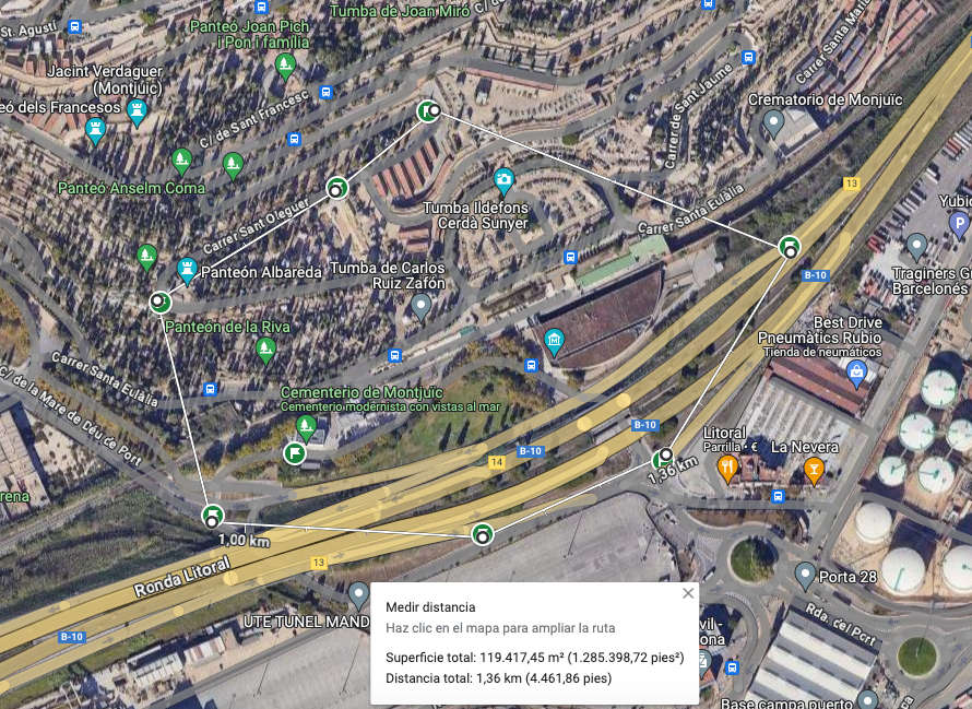 Fig 2. Zona delimitada donde encontré Paratrechina longicornis en el cementerio de Montjuic./ C. Pradera 10-2023