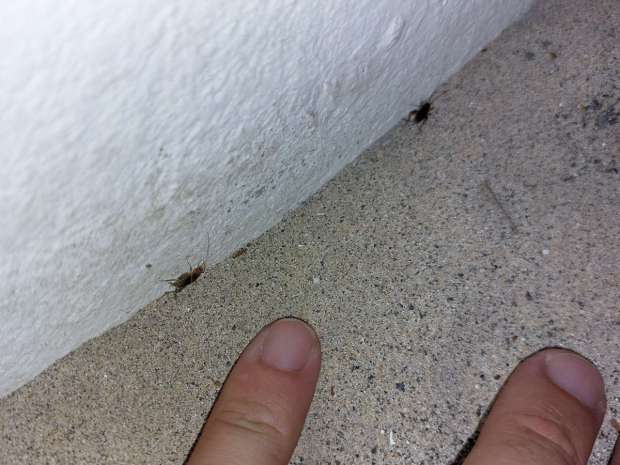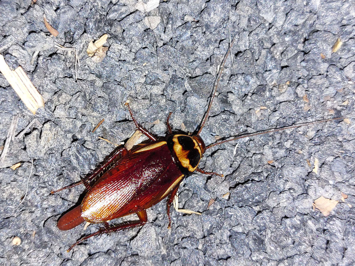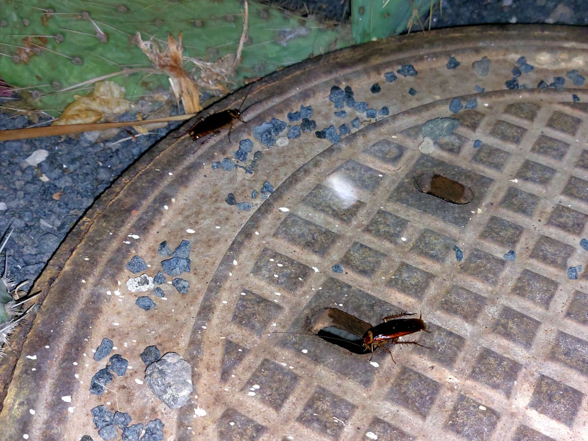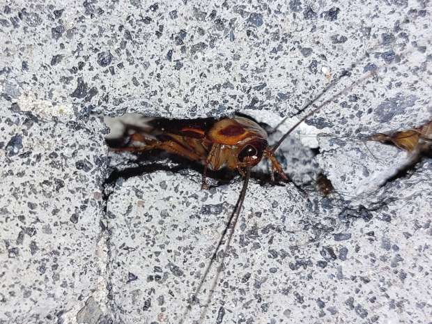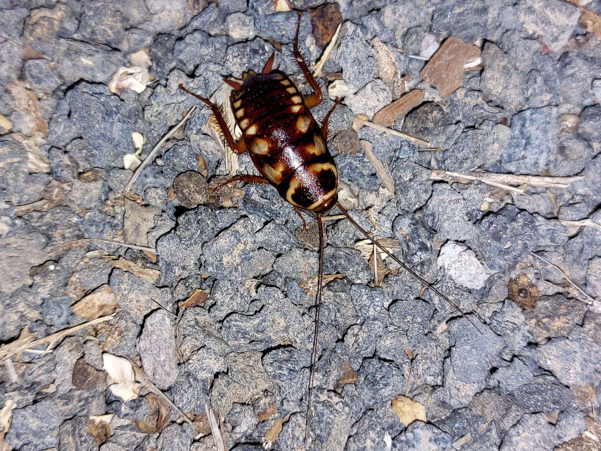 Al poco de caminar encontré cucaracha americana (Periplaneta americana) cerca de unos registros de alcantarillado (figura 11-17). Y poco después encontré cucaracha australiana (Periplaneta australasiae) (figuras 3-10). Había mayor número de cucaracha americana, aunque concentrada alrededor de registros. En el vídeo número 1, se puede ver el cortejo de varios machos sobre una misma hembra que no mostraba muchas ganas. Quizás había ya copulado con otro macho. En cambio, aunque vi menos cucaracha australiana en cuanto a número se refiere, la vi más distribuida sobre parterres, los cuales están cubiertos todos por piedra volcánica (figura 2). Esto muestra que la cucaracha australiana ocupa un espacio diferente al de cucaracha americana, aunque sabemos que estos espacios se pueden solapar. Ahora bien, aunque es lógico pensar que en Lanzarote hay cucaracha australiana de la misma manera que en las otras islas, no hay registro según el Banco de Datos de Biodiversidad de Canarias [2]. Dejo en el blog una primera cita.