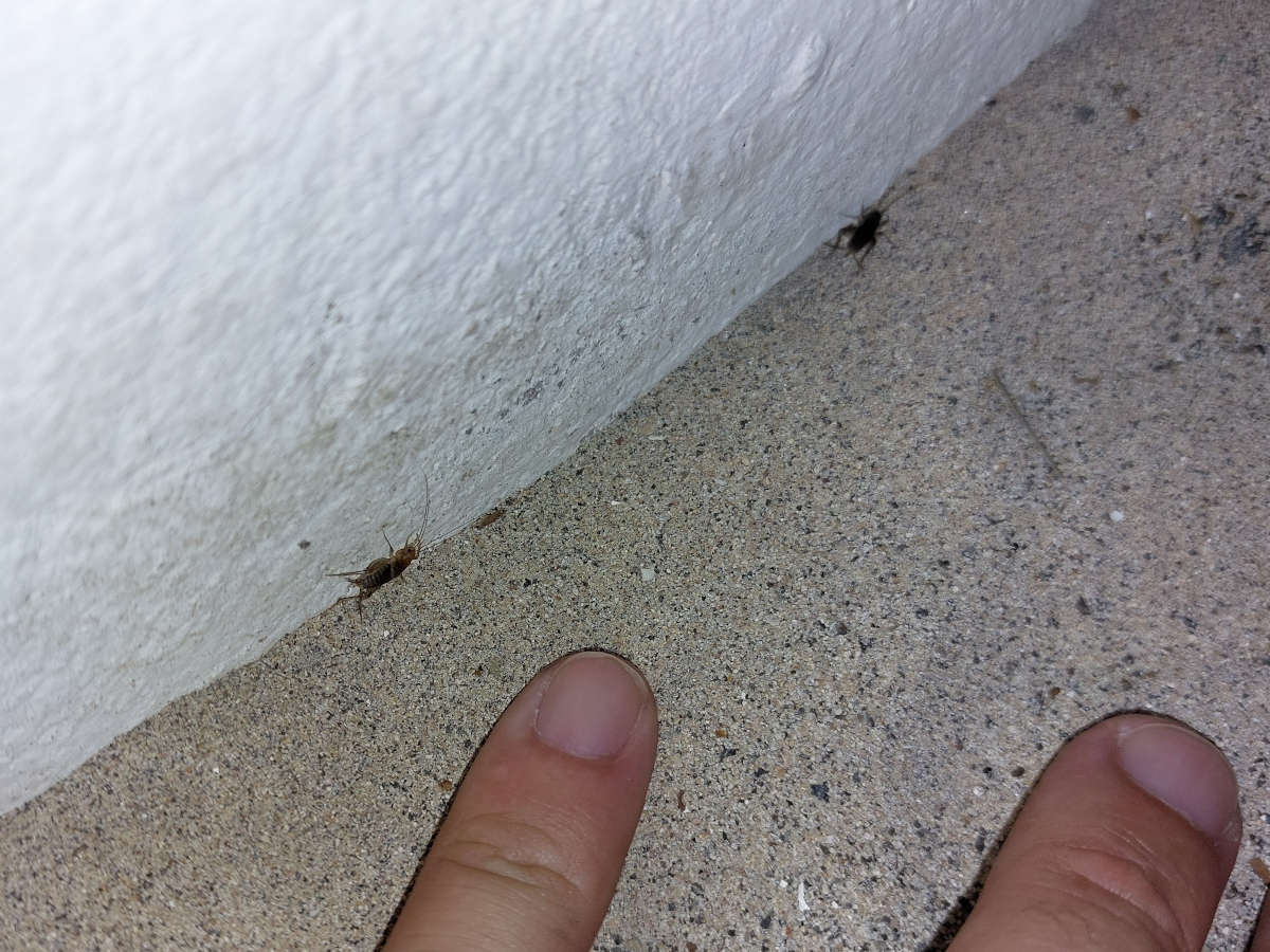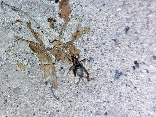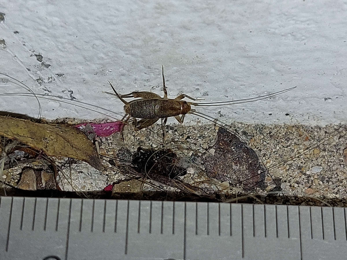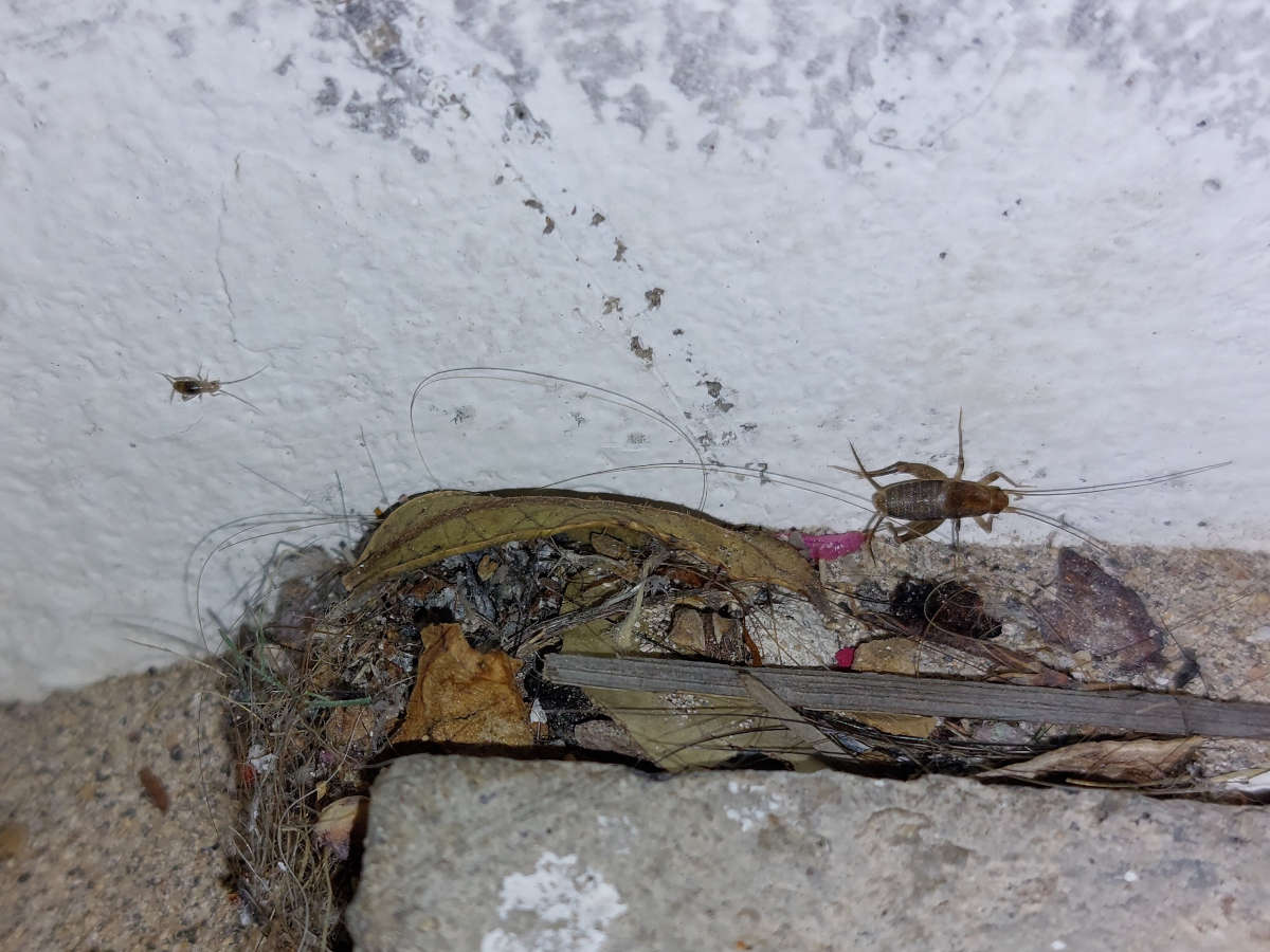 La noche me trajo una sorpresa más. Delante de un bar que se encontraba cerrado en la avenida del Mar, vi unos diminutos grillos cuando me agaché para tomar una fotografía de una cucaracha. Me parecieron interesantes y tomé unas cuantas fotografías (figuras 19-23). Los he identificado como pertenecientes a las especie Cycloptiloides canariensis. Según los datos del Banco de Datos de Biodiversidad de Canarias, esta especie es endémica y está citada para Tenerife, Gran Canaria y Fuerteventura [3]. Ahora bien, Gorochov la encontró en las islas de Ascensión y Santa Elena [4]. El hecho de encontrar un endemismo de Canarias en otras islas del Atlántico situadas muy al sur hizo pensar a este investigador que se trataba de una probable introducción. C. canariensis es un grillo desligado de plantas que puede completar su ciclo alrededor de edificios. La sensación que tuve es que es una especie estructural, ya que lo vi salir de un registro de llave de paso con tapa de cemento que no ajustaba. En el interior había restos de materiales así como hojas.
