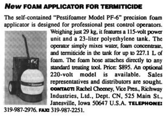 En algún momento, alguien vio la posibilidad de utilizar los generadores de espuma de Richway Industries para su uso contra termitas. Pudo ser la propia compañía o bien alguien de control de plagas le pidió una adaptación de alguna de sus máquinas. Desconozco si con anterioridad hubo otro aparato lanzado por otra compañía. Lo que sí sé es que Pestifoamer fue desarrollado a principios de la década de 1990. En la imagen número 3, se puede ver un anuncio de octubre de 1992 publicado en ‘Commercial News USA’ [4]. Se anuncia como novedad el modelo Pestifoamer Model PF-6. Había dos versiones, para 115 y 220 voltios. El precio era de 895 dólares USA. Richway Industries no solo fabricaba el aparato, sino que también comercializaba el tensioactivo (surfactant) con el nombre de Pestifoamer.