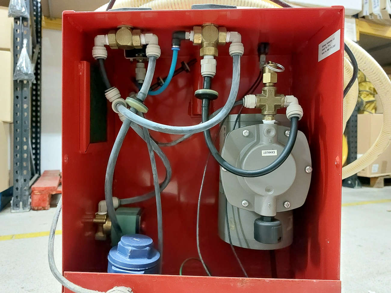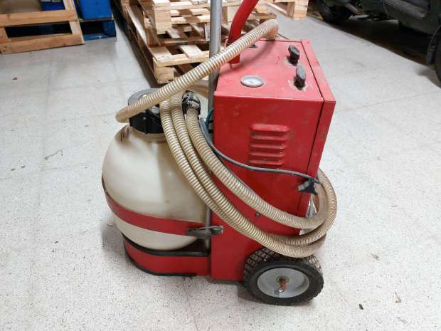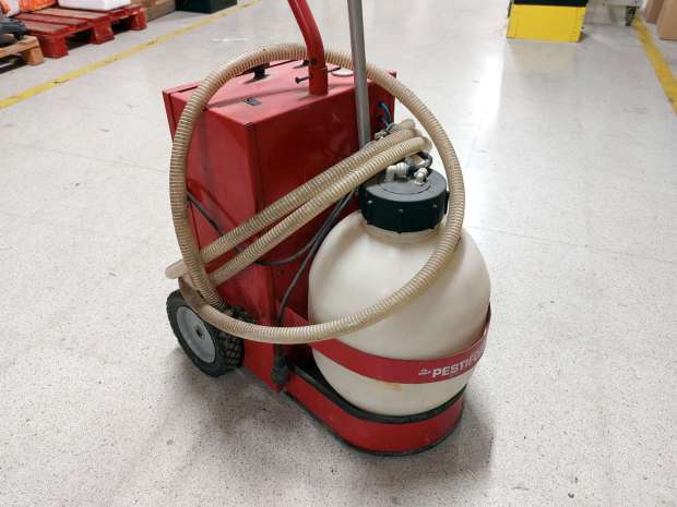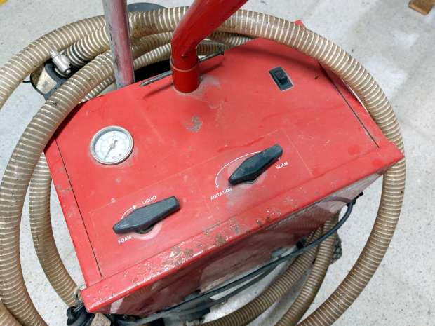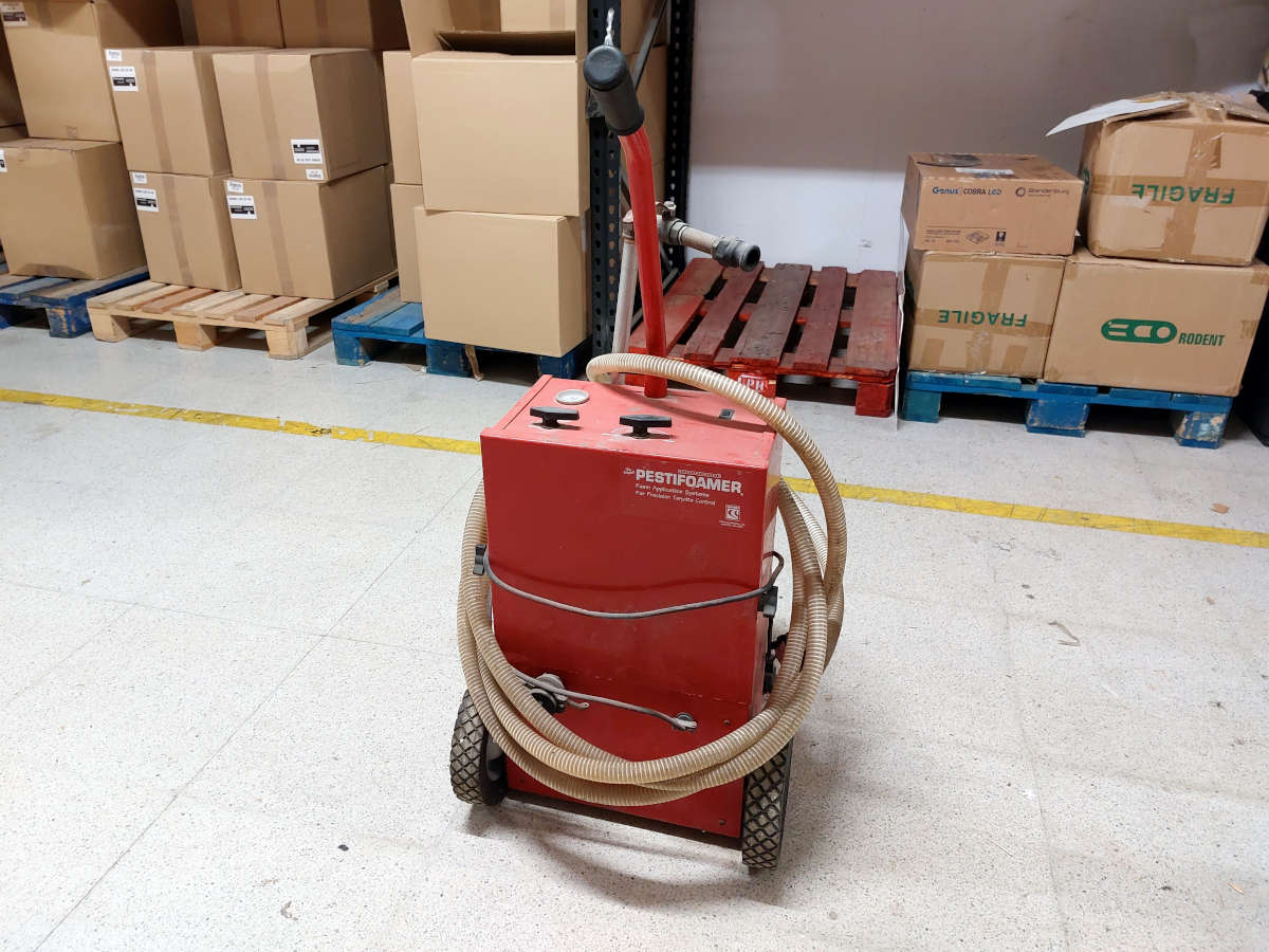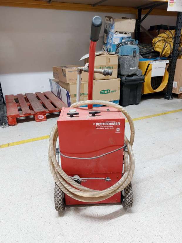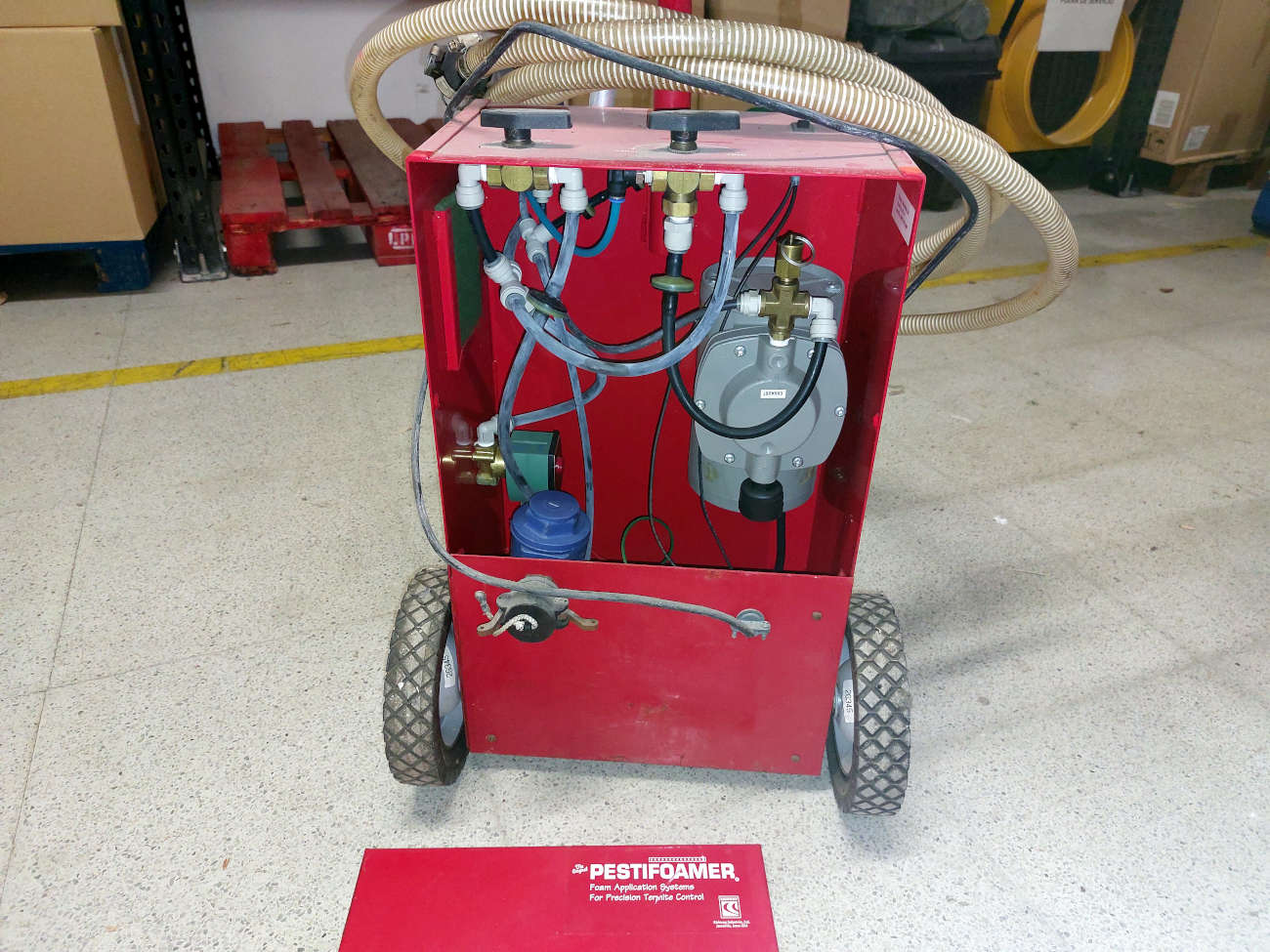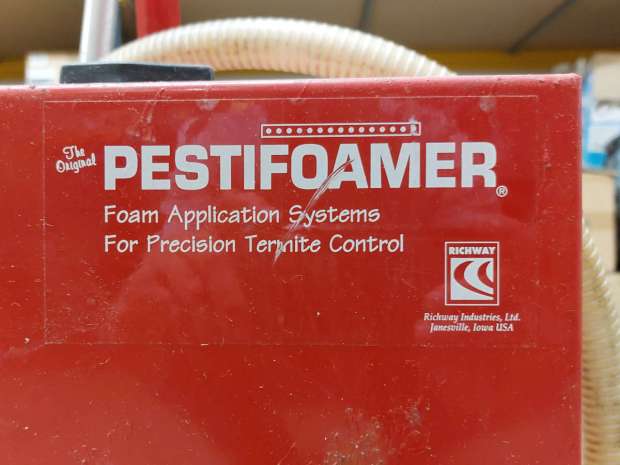 He encontrado una unidad de Pestifoamer PF-6 de Richway Industries Ltd. de Janesville, Iowa, EUA [1]. Se trata de una máquina que genera espuma (foam) para aplicaciones insecticidas de control de termitas. La máquina está fuera de uso y hace años que está aparcada en el almacén. Se compró cuando el único tratamiento de control de termitas subterráneas consistía en realizar una barrera insecticida. A nivel conceptual, pensar en una barrera para proteger una edificación es fácil de comprender. Pero a nivel concreto es muy difícil de realizar. Se trata de envolver una edificación con una película invisible y fina de insecticida. Debe llegar a todas partes por donde puedan acceder las termitas. Implica conocer muy bien la arquitectura de los edificios y los elementos constructivos para llegar a lugares de difícil acceso. En este punto, crear una espuma es un buena idea debido a su capacidad de moverse lateral y verticalmente en un espacio cerrado.
