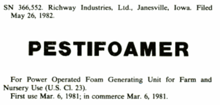 Por lo que respecta a Richway Industries (richway.com), parece que empezó su actividad en 1973. Pero no fue hasta principios de la década de 1980 que empezó a fabricar máquinas para generar espuma. La marca Pestifoamer fue presentada para su registro en mayo de 1982 para uso en granjas: «for power operated foam genetating unit for farm and nursery use» (figura 2). La espuma es muy utilizada para limpiar naves de porcino. Sabemos que el uso de un jabón en forma de espuma permite que la superficie de contacto sea mayor y se mantenga más tiempo húmeda, lo cual permite desincrustar mejor la suciedad.