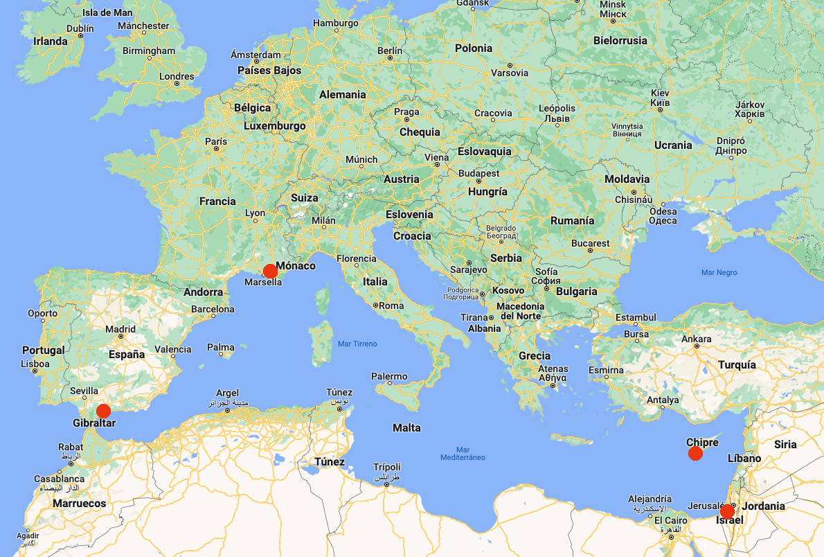 Fig 1. Zonas donde está establecida en exteriores W. auropunctata en el Mediterráneo/ Google Maps 2023