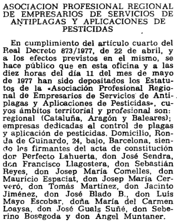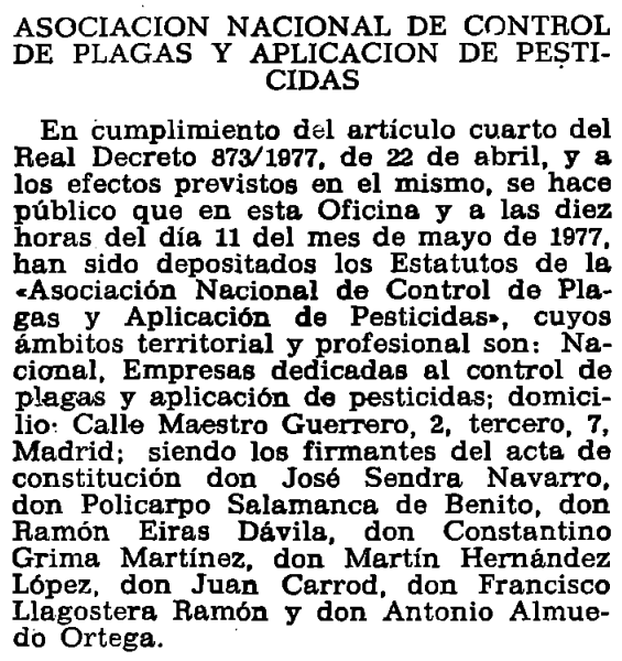 Acogiéndose a la nueva normativa, fueron constituidas asociaciones de carácter laboral por parte de trabajadores, empresarios u otros profesionales. Todo ello creó un entramado de defensa de intereses de clase para buscar representatividad social ante el Estado. Siguiendo las disposiciones legales establecidas [6], los estatutos debían ser depositados en la Oficina de Depósito de Estatutos de Organizaciones Profesionales. A partir de entonces, en el Boletín Oficial del Estado fueron apareciendo anuncios de las asociaciones que se constituían. En el número 116 del 16 de mayo de 1977, página 10.772, aparecieron dos anuncios sobre asociaciones de control de plagas que se acababan de constituir (figuras 1 y 2).