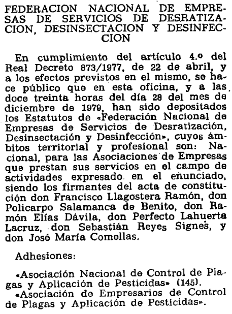 1979 – Federación Nacional de Empresas de Servicios de Desratización, Desinsectación y Desinfección.