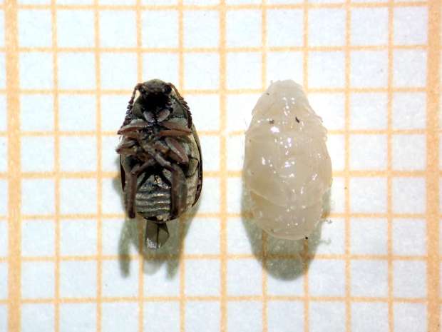 Pero, ¿cómo es su ciclo biológico? En el campo, la hembra deposita los huevos dentro de la vaina y la larva penetra en la semilla donde se desarrolla. En cambio, en el almacén la hembra pone los huevos cerca o debajo de la semilla. El huevo es blanco y alargado de unos 7-8 mm (figura 13). He visto que si la semilla está perforada, la hembra también puede introducir huevos. La larva pasa por cuatro estadios de crecimiento y su crecimiento lo pasa en una sola semilla. La larva del primer estadio perfora la semilla y entra en ella. La larva del cuarto estadio excava una cámara de pupación justo debajo del tegumento. El adulto sale realizando un corte circular en el tegumento lo que da la sensación de ventana redonda. Para hacernos una idea de los que da de sí una semilla, Gliksman & Tucić reportan que en circunstancias de superpoblación hasta 45 adultos pueden surgir de un sola semilla de unos 20 mm de longitud [6].