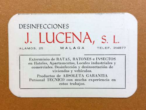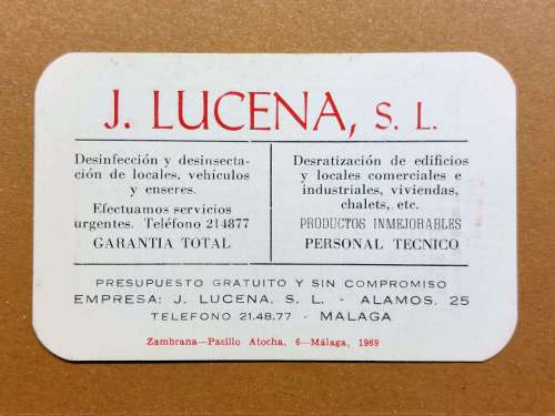 En el caso de los tres calendarios de J. Lucena S.L., en el anverso no aparece imagen alguna relacionada con la empresa ni tan siquiera un logotipo. Simplemente aparece una descripción de los servicios de desinfección, desinsectación y desratización (DDD). Los calendarios no buscan el reclamo, sino que sonun anuncio publicitario directo quizás con la idea de que sirvieran como tarjeta de visita. Es cierto que los calendarios de empresas de servicios útiles eran guardados por contener los teléfonos. El del electricista, fontanero o del taller de mecánica de autos eran importantes. Seguramente se guardaran en un cajón cerca del teléfono y junto a la agenda telefónica. El tamaño de los calendarios es el clásico de 6,5 x 10 cm. Fueron impresos por la Imprenta Zambrana situada en el pasillo Atocha número 6 de Málaga.