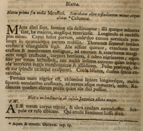 Entre Bartholin y Linneo hubo otros. Son dos los que hicieron una mención seria y bautizaron a esta cucaracha viajera. En primer lugar, el naturalista inglés John Ray (1627 – 1705) hizo mención de la cucaracha americana en su ‘Historia insectorum’ publicada en 1710 [11]. En la página 68 describe dos especies de Blatta, la cucaracha oriental y la cucaracha americana (figura 6). A la primera la nombró como Blatta prima seu mollis Mouffeti. Y a la segunda, como Blatta molendinaria ab insula Jamaica allata major. La transcripción del texto es: «Alae totum corpus tegunt, & ultra caudam extenduritur. Scapulae ex rufo albicant. Qui attulit foeminam fuisse dixit» (página 68).