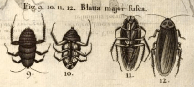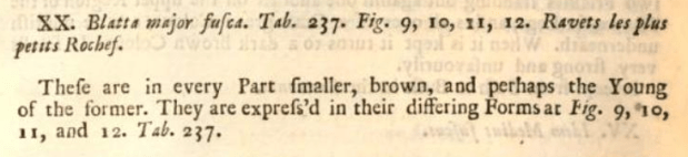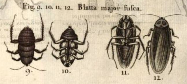 Y en segundo lugar, en 1725 el naturalista irlandés Hans Sloane (1660-1753) publicó dos volúmenes su viaje por diversas islas del Caribe donde describió su flora y fauna. En el capítulo dedicado a Jamaica, en el segundo volumen, nombra la cucaracha americana como Blatta major fusca (figura 7) [2]. Escribe esto sobre ella: «These are in every Part smaller, brown, and perhaps the Young of the former. They are express’d in their differing Forms at Fig. 9, 10, 11, and 12. Tab. 237» (Vol. II, página 204). Explica que se encuentra en todas partes. Y para que no quede duda de a qué especie se refiere, aparece una imagen de un ninfa y un adulto (figura 8).
