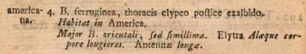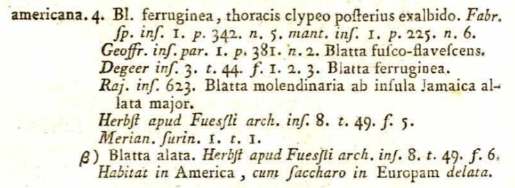 En la edición de 1767, la duodécima, Linneo mejoró la descripción y añadió los autores que con anterioridad habían descrito la especie. En la imagen número 2 se puede ver cómo en la descripción de Blatta americana aparecen los autores anteriores. Posteriormente, en la edición de 1789, la decimotercera, aumentó la descripción. Y también aumentó el número de especies que pasaron a ser 44 [6]. En la imagen número 3 se puede ver la descripción de Blatta americana. Es interesante lo que añade al final: «Habitat in america, cum saccharo in Europam delata». No comprendo bien, pero hace referencia a cuando llegó el azúcar a Europa. Entiendo que quiere decir que empezó a llegar con los barcos que transportaban azúcar.