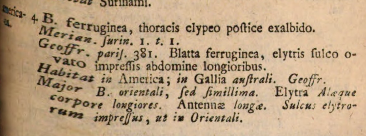 En la edición de 1758, en la décima de su ‘Systema Naturae’, además de Blatta americana, Linneo describió otras nueve especies de cucaracha, todas ellas bajo el género Blatta. Sin embargo, anteriormente había descrito solo dos en la edición de 1748, Blatta molendinaria y Blatta lapponica [3]. La primera tuvo un cambio de nombre en la edición de 1758 y pasó a llamarse Blatta orientalis, aunque también la llamó Blatta ferrugieneo-fusca en otra obra anterior dedicada a la fauna sueca [4]. Y la segunda es la cucaracha silvestre Ectobius lapponicus. Respecto al nombre de molendinaria, venía de lejos y se refería a que era propia de molinos de harina.