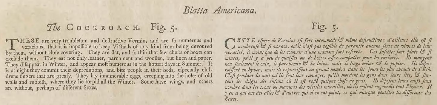 La transcripción del texto es esta: «These are very troublesom and destructive Vermin, and are so numerous and voracious, that it is impossible to keep Victuals of any kind from being devoured by them, without close covering. They are flat, and so thin that few chests or boxes can exclude them. They eat not only leather, parchment and woollen, but linen and paper. They disappear in Winter, and appear most numerous in the hottest days in Summer. It is at night they commit their depredations, and bite people in their beds, especially childrens fingers that are greasy. They lay innumerable eggs, creeping into the holes of old walls and rubbish, where they lie torpid all the Winter. Some have wings, and others are without, perhaps of different Sexes» (Apéndice, página 10).