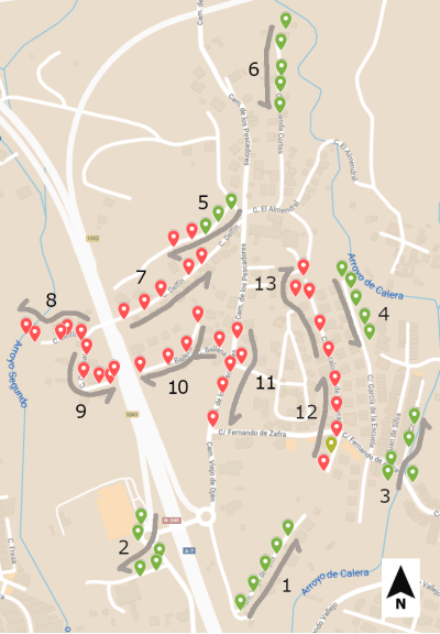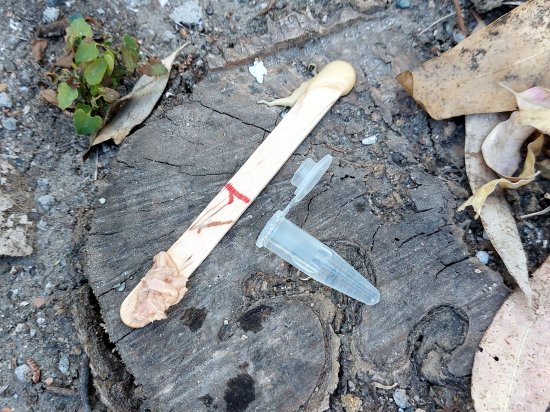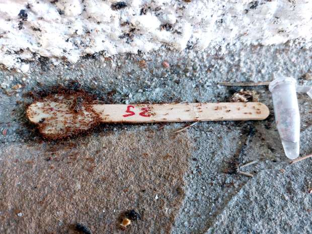Junto al estudio del área ocupada, nos dedicamos a muestrear para saber si este espacio estaba ocupado por Wasmannia en exclusividad o bien había otras especies. Para ello establecimos 13 transectos dispuestos sobre el terreno (figura 2). Cada uno constaba de 5 puntos de cebado separados por unos 35 metros. En total fueron 65 puntos en los que dispusimos agua con azúcar, atún y manteca de cacahuete tal y como se puede ver en la imagen número 3. El resultado fue que en la zona ocupada por Wasmannia no había otra especie más que ella. Y en las zonas no ocupadas detectamos 14 especies, lo cual da un poco de imagen de la riqueza de una zona degradada como es un entorno alterado ocupado antes por cultivos y ahora por viviendas.