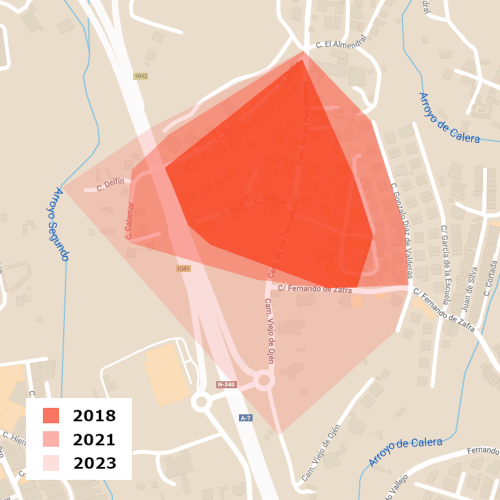 Después de 2018, Xavier Espadaler y un servidor hemos estado sobre el terreno dos veces más. Una en 2021 y otra en abril del año pasado que hemos reflejado en un artículo publicado este 2024 [2]. Esto nos ha permitido observar cómo crecía el área ocupada. Así, en 2021 aumentó a unas 9,9 hectáreas y en 2023 se había expandido por unas 16,0 hectáreas. En n unos 5 años ha aumentado en un 180% la superficie ocupada. Pero no solo eso, sino que observamos cómo se había adentrado en el Arroyo Segundo, una zona húmeda que suele llevar algo de agua. Esto va a permitir que Wasmannia se expanda más rápidamente si cabe y va a hacer muy difícil un control dirigido a su erradicación.