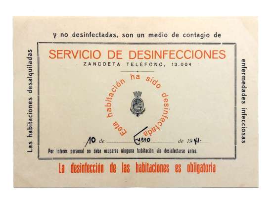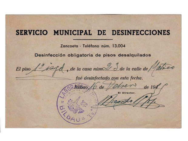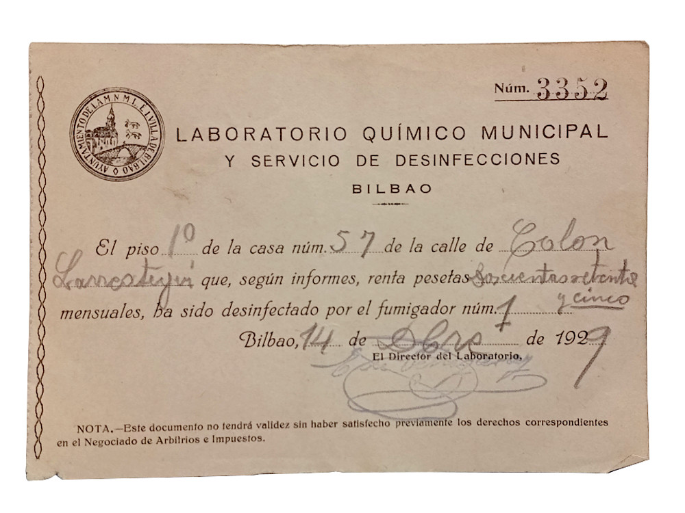 Hace un par de años encontré a la venta el libro ‘El Servicio Municipal de Desinfecciones de Bilbao’ de Juan Gondra Rezola (Bilbao, 1946) [1]. Lo adquirí para tener una mayor perspectiva histórica del sector de control de plagas, puesto que la mayor parte de información que tengo es referente a Barcelona y Madrid. Además, recientemente adquirí un certificado de desinfección de una habitación de Bilbao fechado en 1946 y emitido por el Servicio de Desinfecciones de Bilbao (figura 2). Así pues, aprovecho el material que he recabado para explicar someramente cómo se desarrolló este servicio municipal que tan necesario fue hasta la década de 1940 y que posteriormente fue decayendo su necesidad.