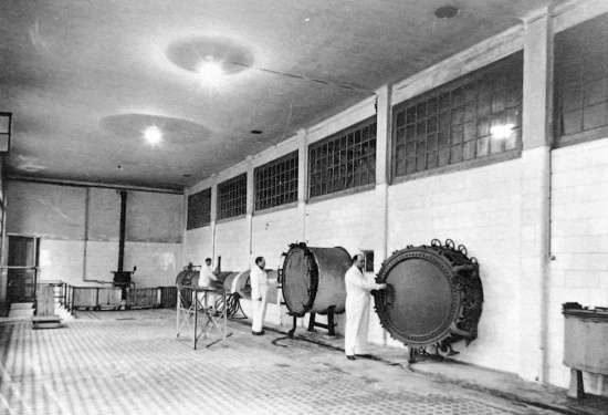 Fig 5. Sala de desinfecciones desde el lado sucio. Empotradas la lejiadora, dos autoclaves y tres lavadoras. Al fondo, el horno./ Gondra 2011