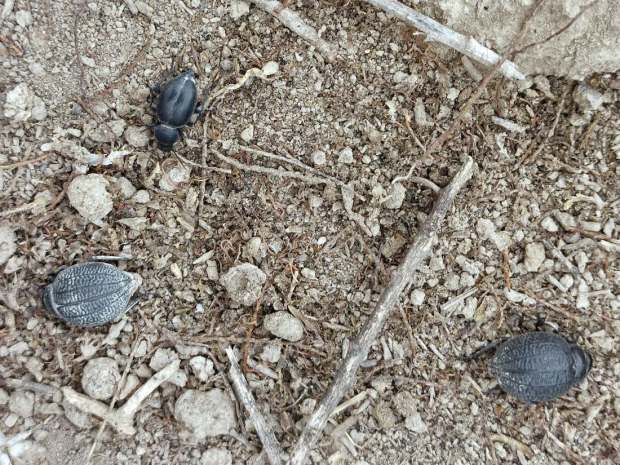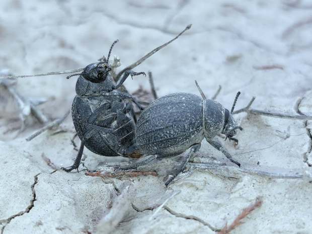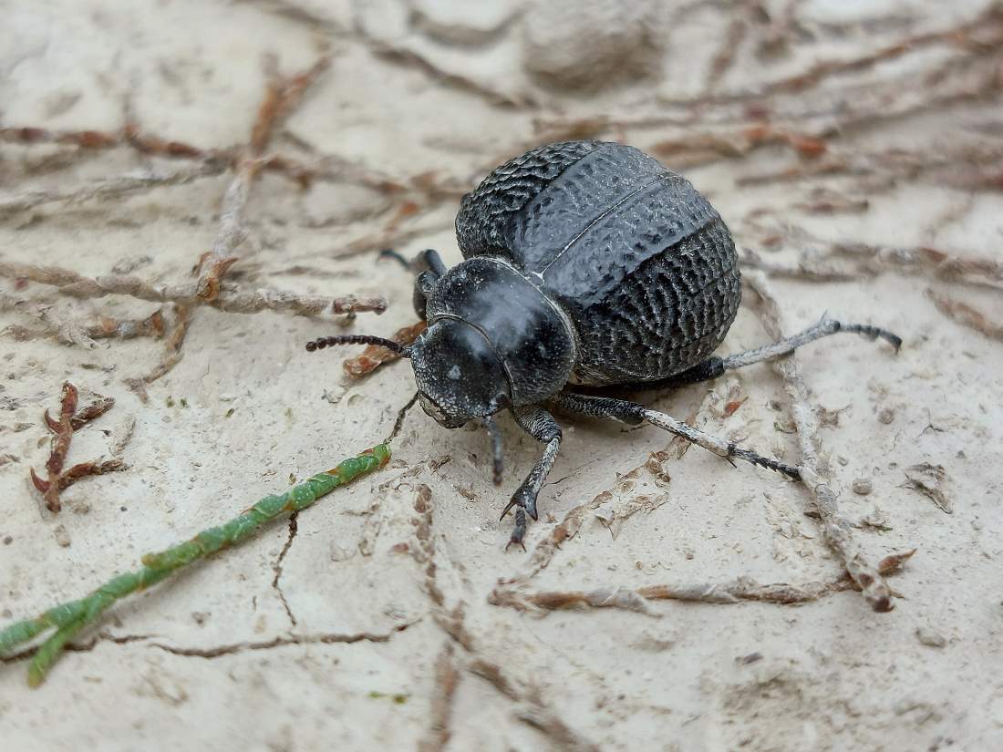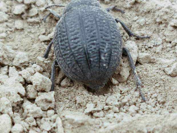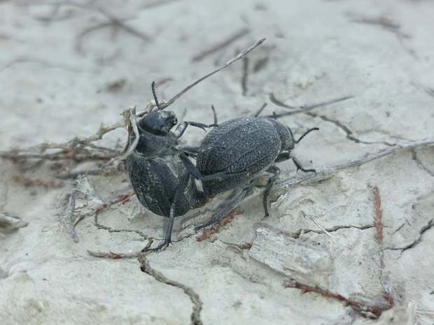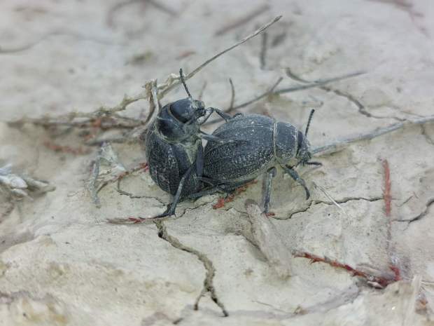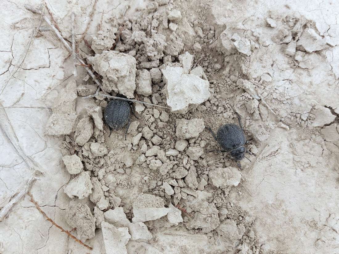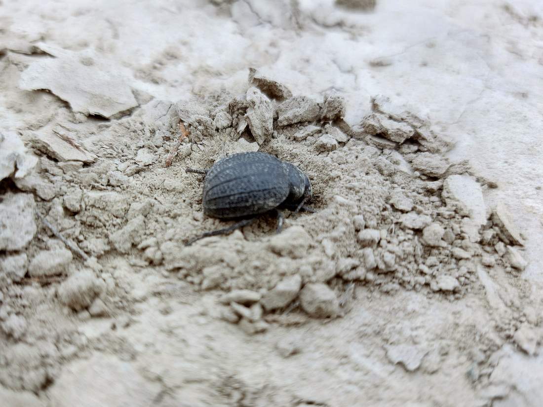En principio, lo que tenía delante eran dos especies de la subfamilia Pimeliinae. Lo que más abundaba eran individuos de alguna especie del género Pimelia (figuras 4-21) [1]. Y en menor medida, individuos del género Tentyria (figuras 22-27) [2]. En cuanto a su comportamiento, vi individuos deambular de un lado para otro. Vi la cópula de ambas especies. Y también vi cómo las hembras buscaban un lugar en el suelo para realizar la puesta. El suelo estaba duro y apelmazado. En aquellos lugares donde estaba suelto, las hembras aprovechaban para hacer la puesta. Bajo los tamarindos, el suelo estaba removido por los conejos y abundaban los excrementos. Allí las hembras buscaban dejar los huevos si dificultad. Fuera de la zona de tamarindos, el paso de un coche había dejado la marca de las roderas. Esto había roto el suelo apelmazado dejando al descubierto la arena. En esas roturas, las hembras aprovechaban para hundir el extremo del abdomen.