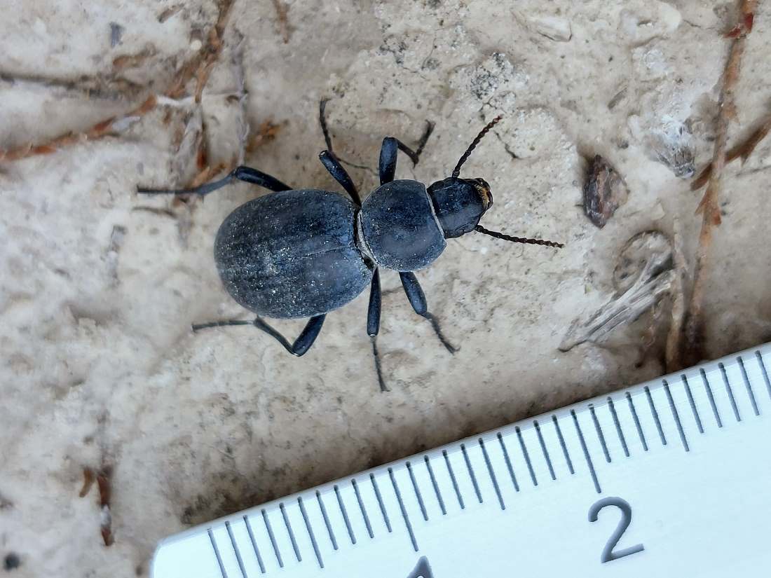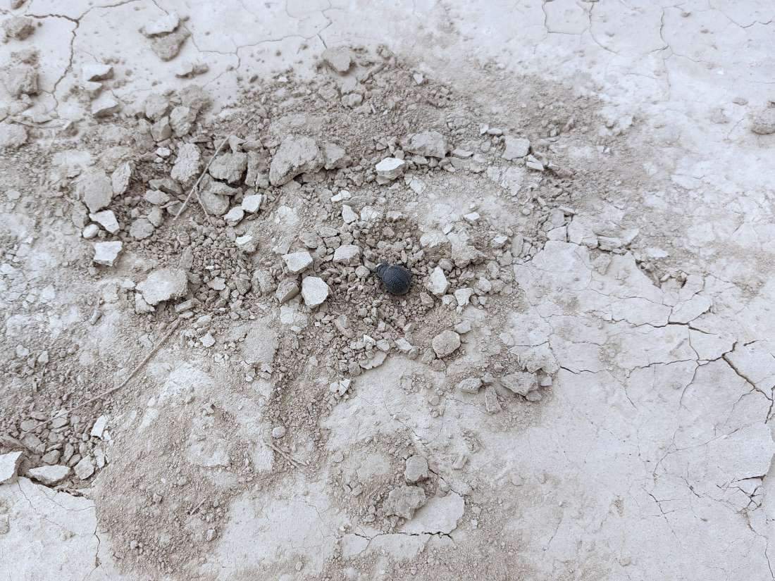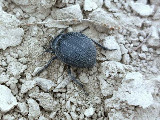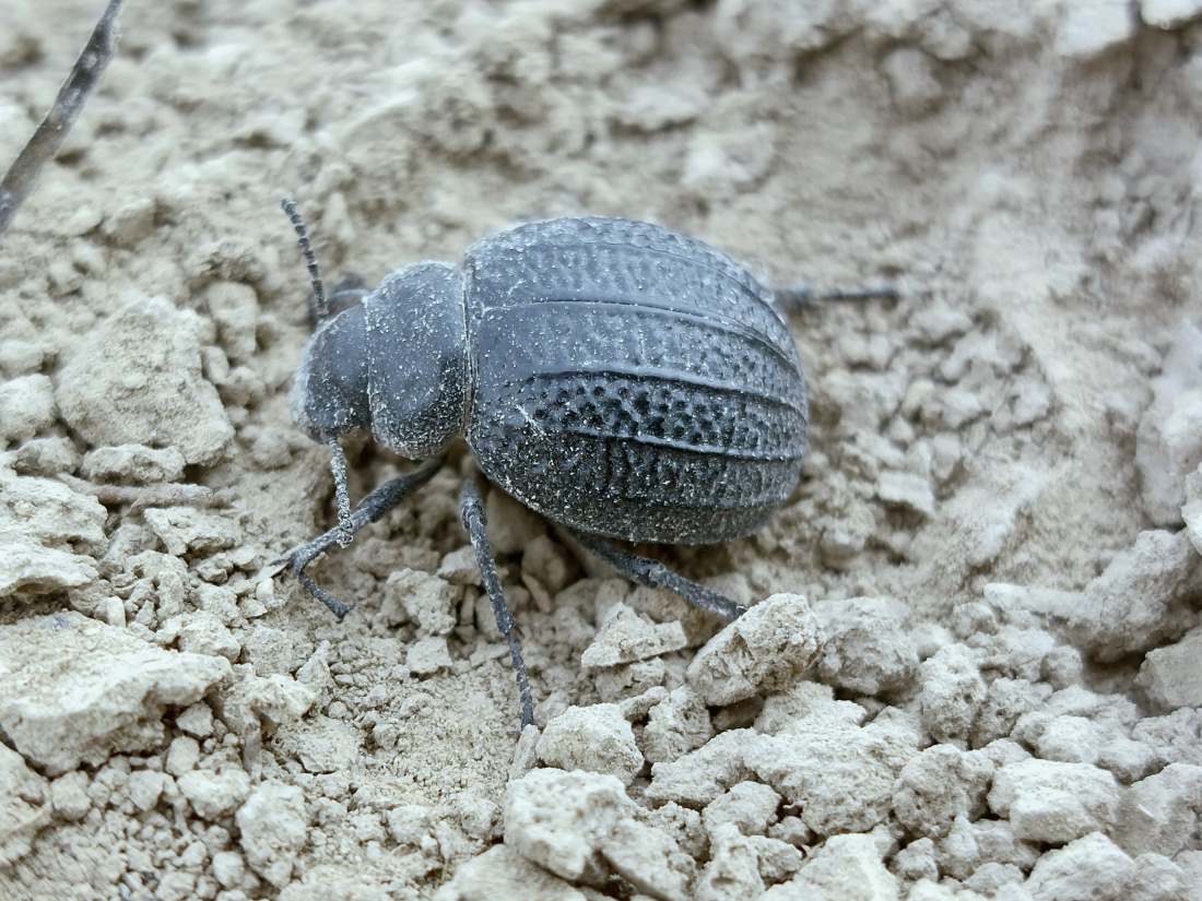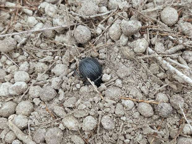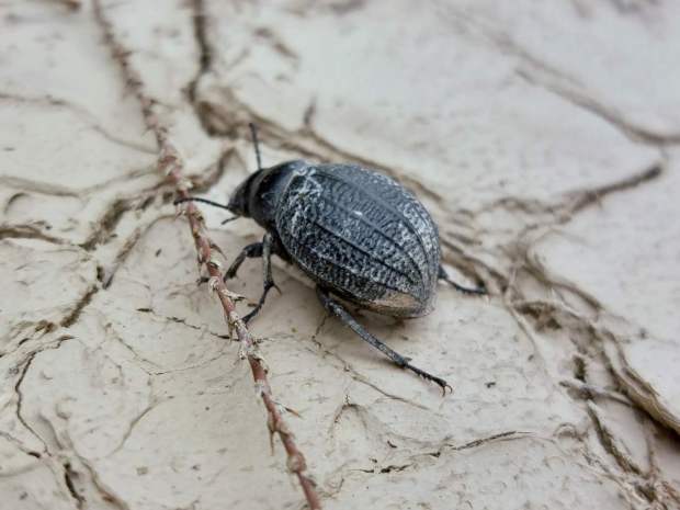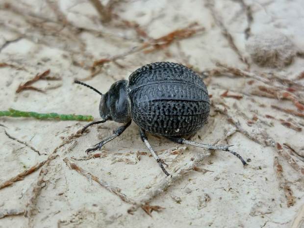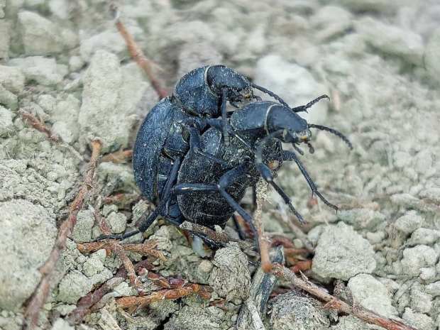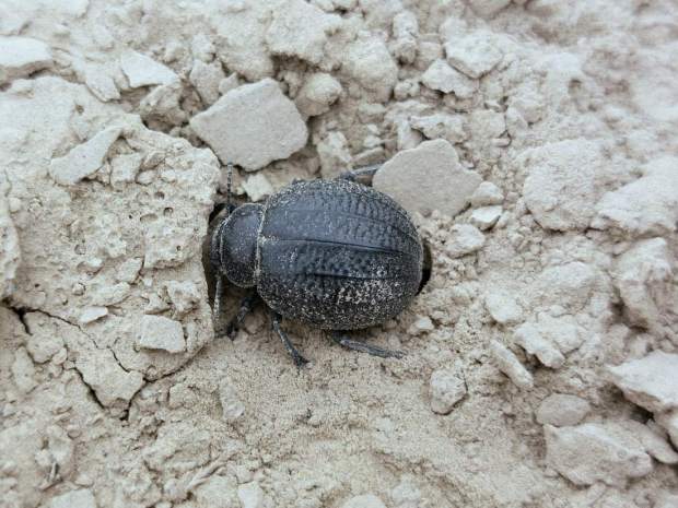 En principio, lo que tenía delante eran dos especies de la subfamilia Pimeliinae. Lo que más abundaba eran individuos de alguna especie del género Pimelia (figuras 4-21) [1]. Y en menor medida, individuos del género Tentyria (figuras 22-27) [2]. En cuanto a su comportamiento, vi individuos deambular de un lado para otro. Vi la cópula de ambas especies. Y también vi cómo las hembras buscaban un lugar en el suelo para realizar la puesta. El suelo estaba duro y apelmazado. En aquellos lugares donde estaba suelto, las hembras aprovechaban para hacer la puesta. Bajo los tamarindos, el suelo estaba removido por los conejos y abundaban los excrementos. Allí las hembras buscaban dejar los huevos si dificultad. Fuera de la zona de tamarindos, el paso de un coche había dejado la marca de las roderas. Esto había roto el suelo apelmazado dejando al descubierto la arena. En esas roturas, las hembras aprovechaban para hundir el extremo del abdomen.
