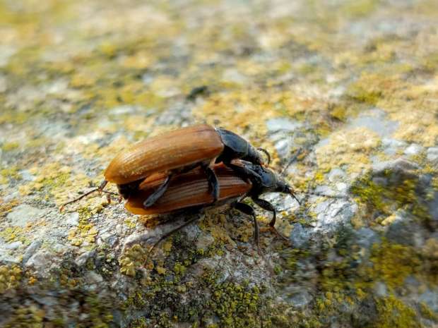 Ayer domingo pude ver un montón de coleópteros de la especie Megischia curvipes cerca de la entrada al recinto arqueológico de Empúries en la población de l’Escala, Girona (figura 1). El suelo estaba lleno de individuos muertos aplastados por las ruedas de los coches (figuras 2 y 3). Esto me dio a entender que los adultos de esta especie llevan días aterrizando en la zona para encontrar pareja sexual. Estaban apiñados sobre varios lugares como en un cubo de piedra para evitar que se instalen los vehículos. En las imágenes que acompañan a esta entrada doy cuenta del gran número. Tomando fotografías, dos aterrizaron sobre mi espalda. Macho y hembra estaban por la labor de emparejarse.