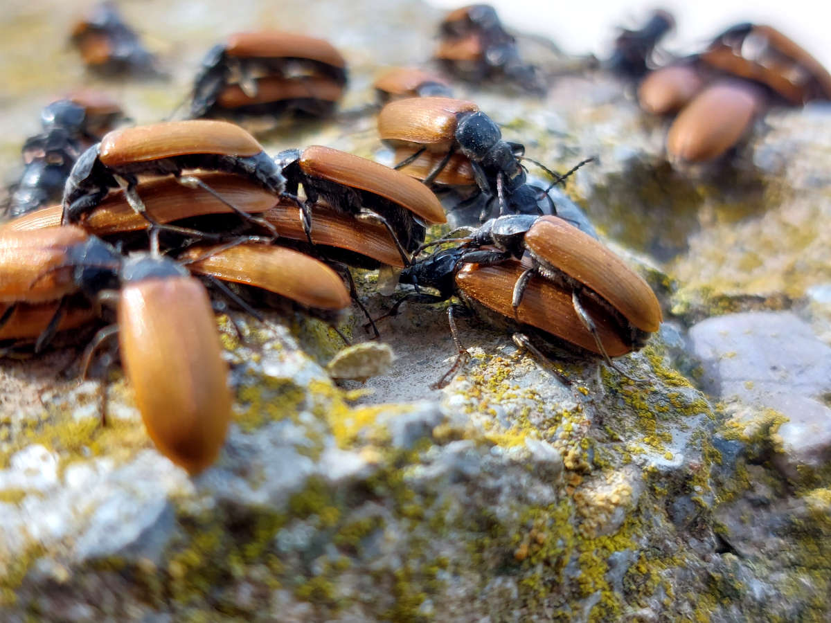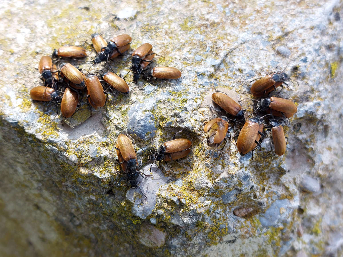 Ayer domingo pude ver un montón de coleópteros de la especie Megischia curvipes cerca de la entrada al recinto arqueológico de Empúries en la población de l’Escala, Girona (figura 1). El suelo estaba lleno de individuos muertos aplastados por las ruedas de los coches (figuras 2 y 3). Esto me dio a entender que los adultos de esta especie llevan días aterrizando en la zona para encontrar pareja sexual. Estaban apiñados sobre varios lugares como en un cubo de piedra para evitar que se instalen los vehículos. En las imágenes que acompañan a esta entrada doy cuenta del gran número. Tomando fotografías, dos aterrizaron sobre mi espalda. Macho y hembra estaban por la labor de emparejarse.