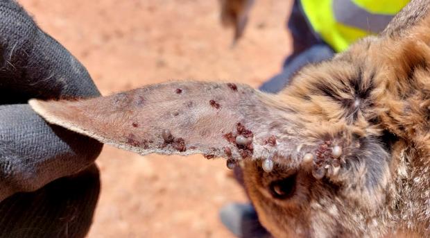 Fig 1. Conejo (Oryctolagus cuniculus) parasitado por garrapatas en Caudete, Albacete./ C. Julen Zuberogoitia 05-2024