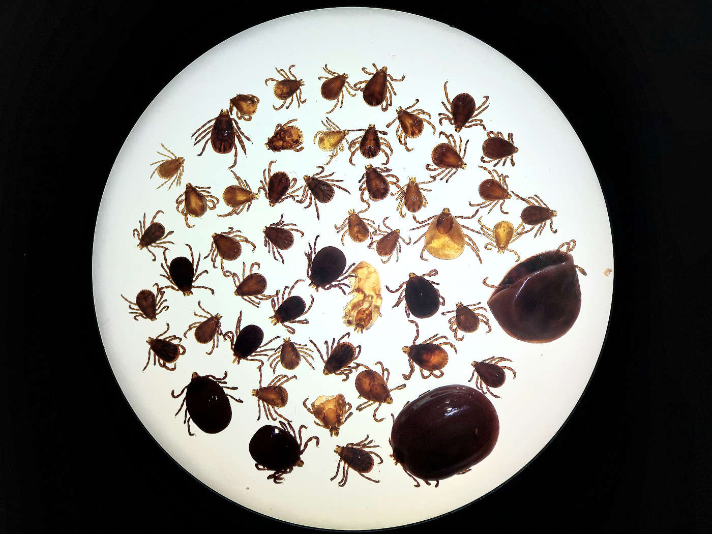 Lo que había en la muestra son dos especies que podemos encontrar en el conejo en la península Ibérica: Rhipichephalus pusillus y Haemaphysalis hispanica [2, 3]. Ambas especies fueron descritas por Gil Collado, la primera en 1936 y la segunda en 1938. De R. pusillus había 50 individuos, 17 hembras y 33 machos. Mientras que de H. hispanica solo había una hembra. En al imagen número 2 se pueden ver todos los ejemplares. Algunos solo estaban parcialmente, pues al extraerlos se rompieron. Y en la imagen número 3, se puede ver una hembra de cada especie.